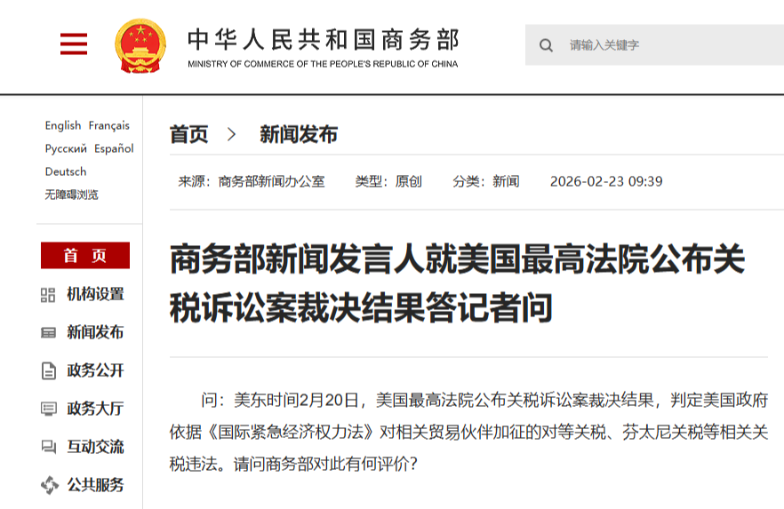 商務部新聞發言人表示,我們注意到美國最高法院公布關稅訴訟案裁決結果,正在對相關內容和影響進行全面評估。中方一貫反對各種形式的單邊加徵關稅措施,反覆強調貿易戰沒有贏家,保護主義沒有出路。美方對等關稅、芬太尼關稅等單邊措施既違反國際經貿規則,也違反美國內法,不符合各方利益。