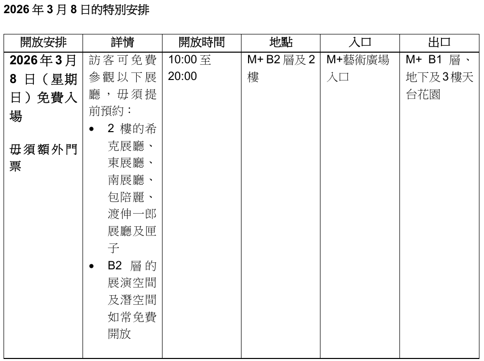 指定展覽包括位於博物館2層的「M+希克藏品:心靈圖景」、「物件·空間·互動」、「造物記」、「山鳴水應」、「勞森伯格與亞洲」,以及「鹽田千春:無限回憶」;位於B2層展演空間的「坂本龍一 | 觀音・聽時」、B2層潛空間的「傅丹創意現場:野口勇的『光』」,以及位於LG層的多媒體中心將會如常免費開放。訪客亦可於當天在多媒體中心和大台階免費觀看放映節目。