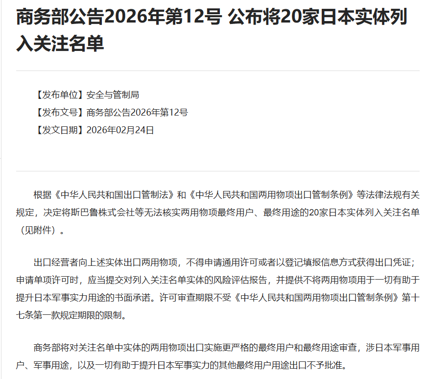 【點新聞報道】商務部今日(24日)發布公告,公布將20家日本實體列入關注名單。公告指,根據《中華人民共和國出口管制法》和《中華人民共和國兩用物項出口管制條例》等法律法規有關規定,決定將斯巴魯株式會社等無法核實兩用物項最終用戶、最終用途的20家日本實體列入關注名單。