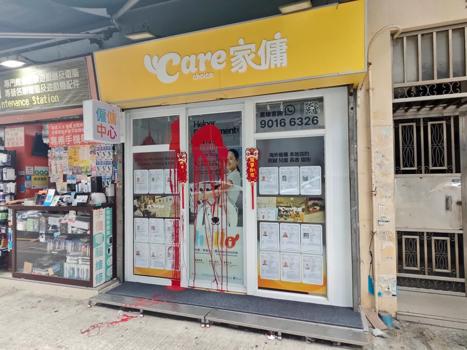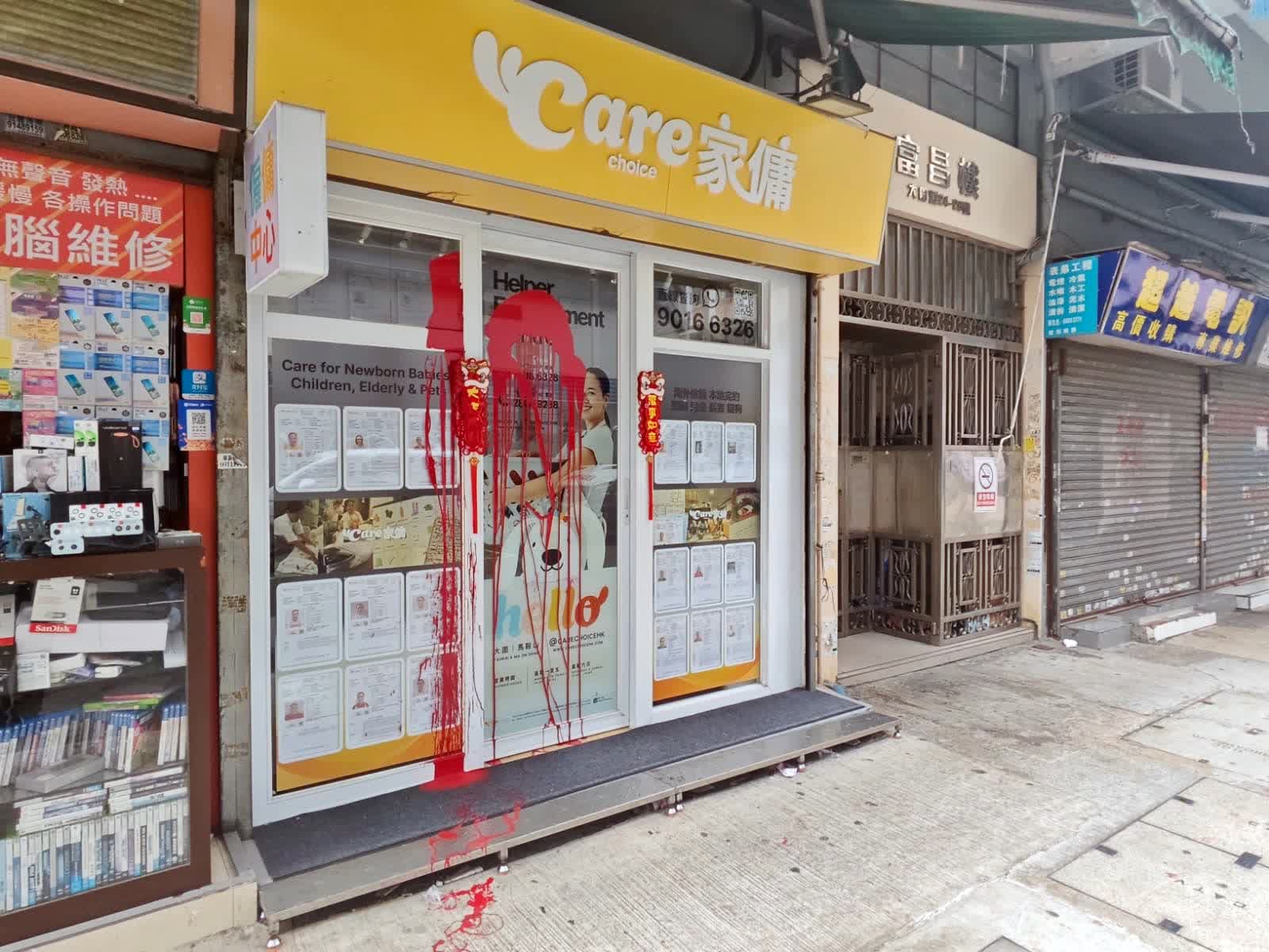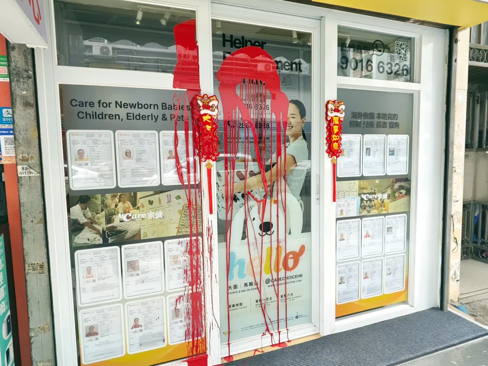 【點新聞報道】今日(24日)大年初八中午12時20分,警方接獲大圍積德里6號地下一間外傭中介公司的職員報案,指玻璃門及櫥窗遭人潑淋紅色油漆。