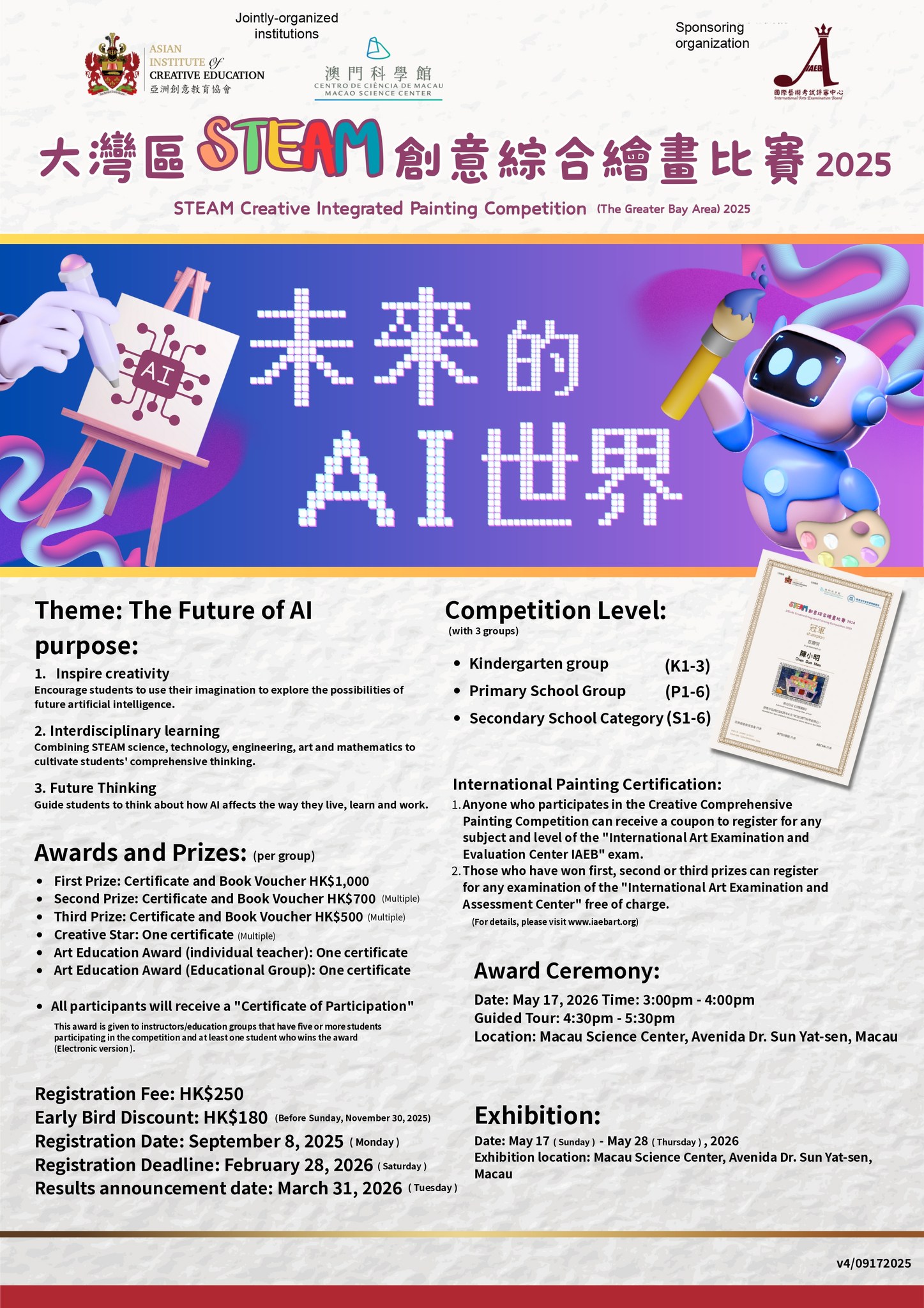 由亞洲創意教育協會與澳門科學館合辦的「大灣區STEAM創意綜合繪畫比賽2025」,以「未來的AI世界」為主題,鼓勵學生發揮想像力,探索人工智能的未來,並結合STEAM科學、技術、工程、藝術和數學思維,思考AI如何影響生活、學習與工作模式。