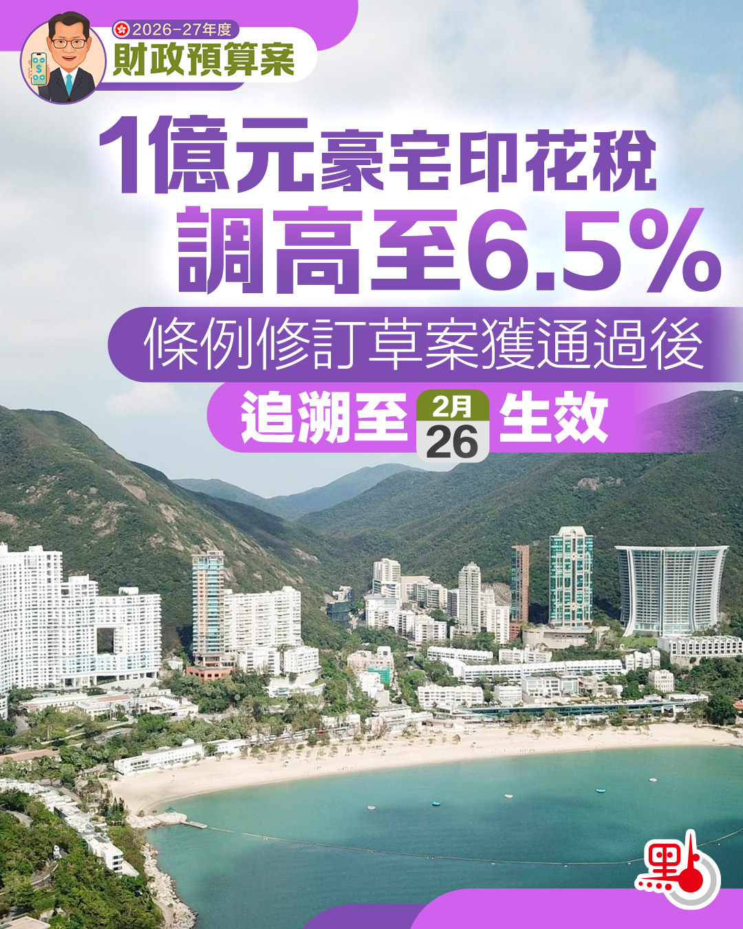 預算案|1億元以上豪宅印花稅調高至6.5% 明起生效
