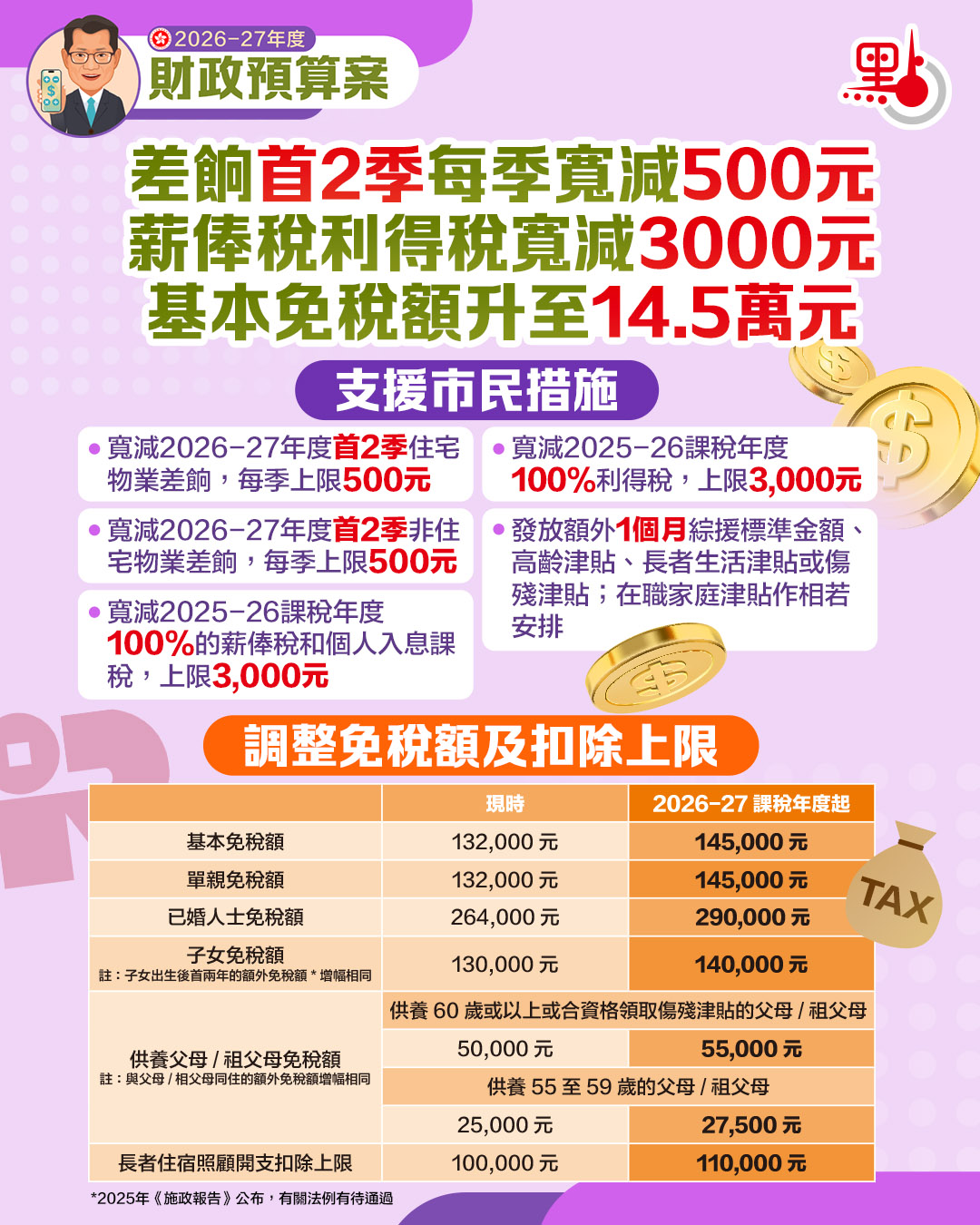 (有片)預算案|基本免稅額升至14.5萬 子女免稅額升至14萬