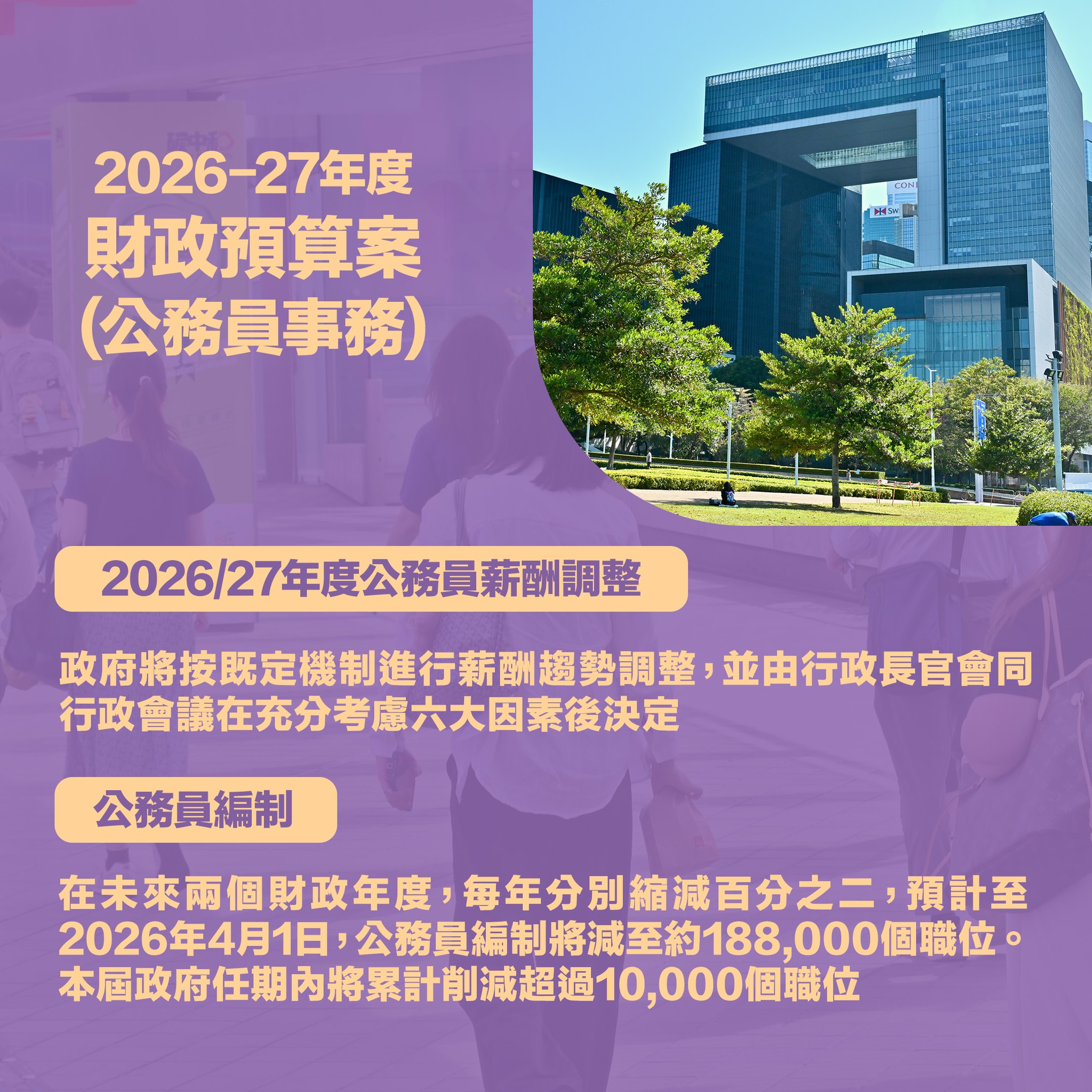 楊何蓓茵指出,政府亦會持續落實財政整合計劃,繼續嚴格控制政府經營開支增長。為了持續優化人力資源的運用,公務員編制在未來兩個財政年度,每年分別縮減2%,預計至2026年4月1日,公務員編制將減至約188,000個職位。本屆政府任期內將累計削減超過10,000個職位。實踐證明,各部門在過去多年持續檢視資源分配和工作優次,並通過整合內部資源、精簡程序及運用科技,致力以更高成本效益為市民提供優質服務,至今已取得一定成效。在未來一段時間,她有信心公務員團隊會繼續專業高效,善用現有資源,致力為市民提供高水平的公共服務。
