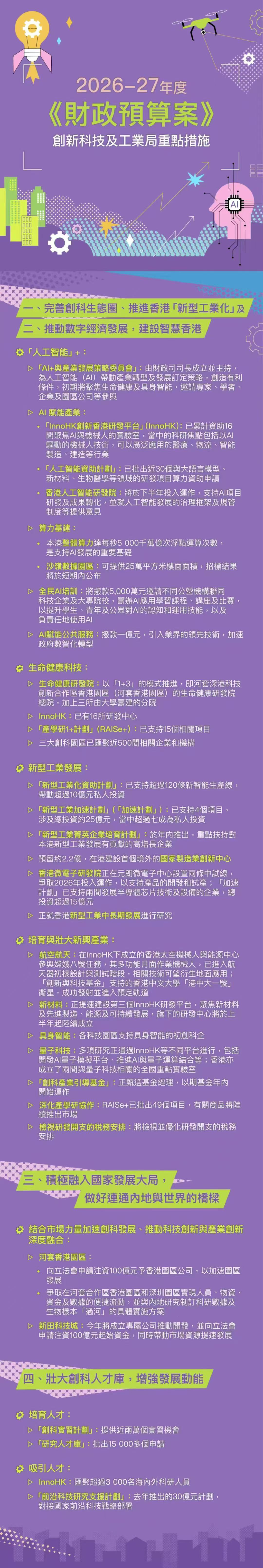 在新興產業培育方面,香港在航空航天領域取得進展,InnoHK下成立的香港太空機械人與能源中心參與嫦娥八號任務,其多功能機械人已進入設計測試階段。同時,政府正提速建設聚焦新材料及先進製造的第3個InnoHK研發平台。各科技園區亦正支持具身智能領域的初創企業,而多項量子科技研究亦正透過不同平台進行。此外,「創科產業引導基金」正甄選基金經理,以期年內開始運作。政府亦將檢視並優化研發開支的稅務安排。