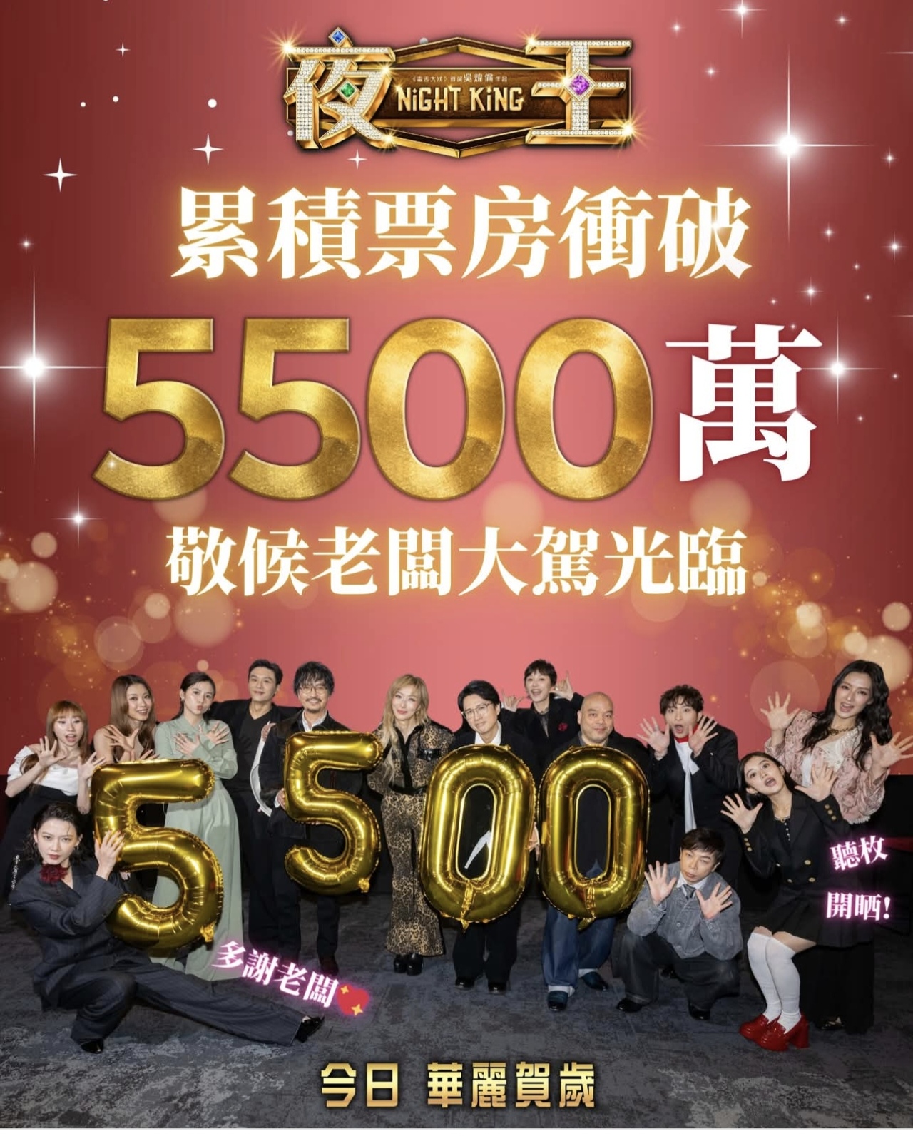 【點新聞報道】黃子華、鄭秀文領銜主演的賀歲片《夜王》票房再報捷,截至今(25日)早累積票房已衝破5500萬,片方隨即在社交平台發文答謝觀眾支持,並以「多謝各位老闆,即送大果盤,散啲口碑出去靠大家嘞」等字句回應熱潮,同時呼籲觀眾繼續入場,「《夜王》,繼續戲院見」。據悉,雖然新春假期已完,《夜王》依然旺場,有某些戲院排片上全部是《夜王》。