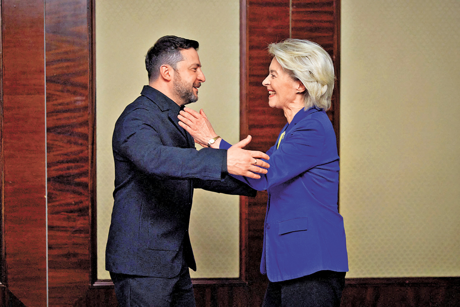澤連斯基當日會晤馮德萊恩與歐盟理事會主席科斯塔。馮德萊恩在記者會上宣稱,烏克蘭正朝正確方向改革,但入歐取決於烏克蘭是否達標:「我們無法列出具體日期,但歐盟對烏克蘭的支持是明確的。」馮德萊恩表示,歐盟已向烏克蘭提供約2,000億歐元(約1.85萬億港元)援助,至於早前承諾價值900億歐元(約8,293億港元)的貸款計劃,目前在歐盟內部受阻,馮德萊恩承諾日後會用不同方式撥付。
