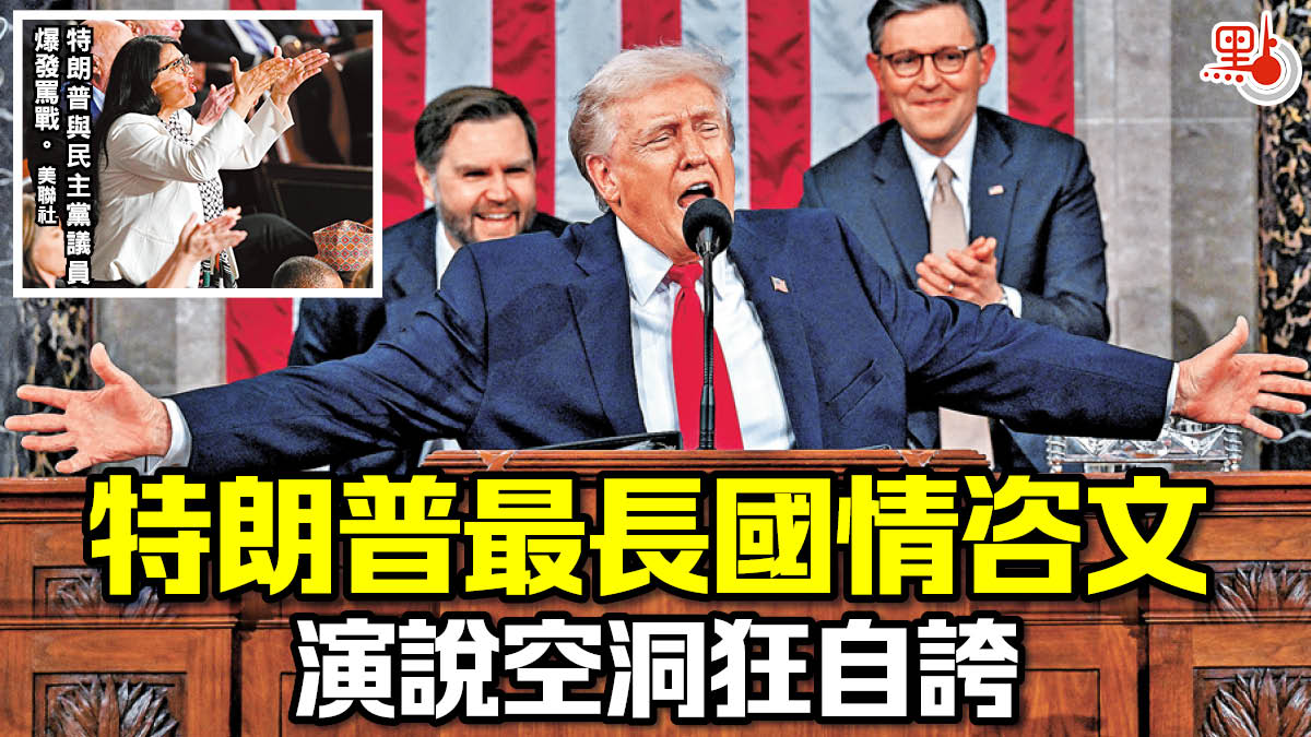 【點新聞報道】美國總統特朗普在美東時間2月24日晚上9時(香港時間25日上午10時),在國會眾議院發布國情咨文,是次持續長達1小時48分鐘的演說,創下美國總統歷來發布國情咨文的最長紀錄。特朗普極力誇大自己的經濟和外交成就,宣稱在其治下,美國迎來「黃金時代」,較任何時候更強大美好。分析也指特朗普空洞的發言,或難以拉攏備受通脹所困的中低收入支持者群體。