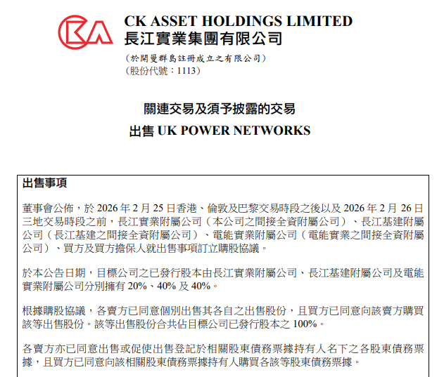 【點新聞報道】長實集團今日(26日)在港交所公告,長實附屬公司、電能實業附屬公司等就出售UK POWER NETWORKS訂立協議。長建、電能及長實分別持有UK POWER NETWORKS的40%、40%及20%的股權。