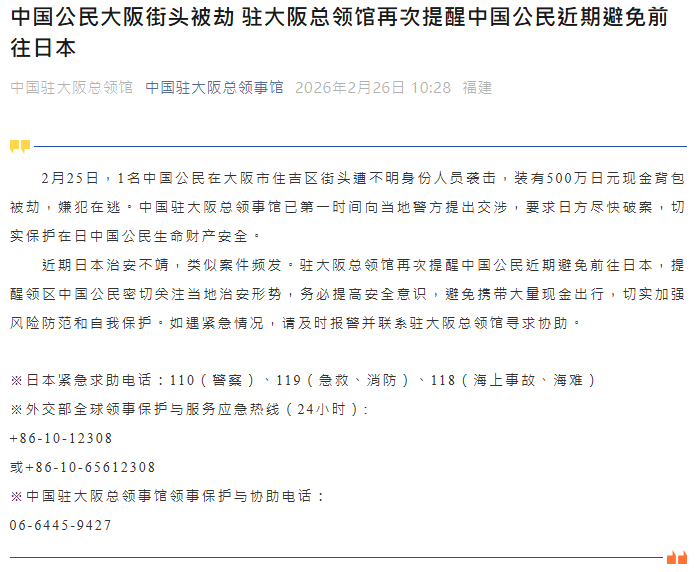 領事館表示,近期日本治安不靖,類似案件頻發。駐大阪總領館再次提醒中國公民近期避免前往日本,提醒領區中國公民密切關注當地治安形勢,務必提高安全意識,避免攜帶大量現金出行,切實加強風險防範和自我保護。如遇緊急情況,請及時報警並聯繫駐大阪總領館尋求協助。