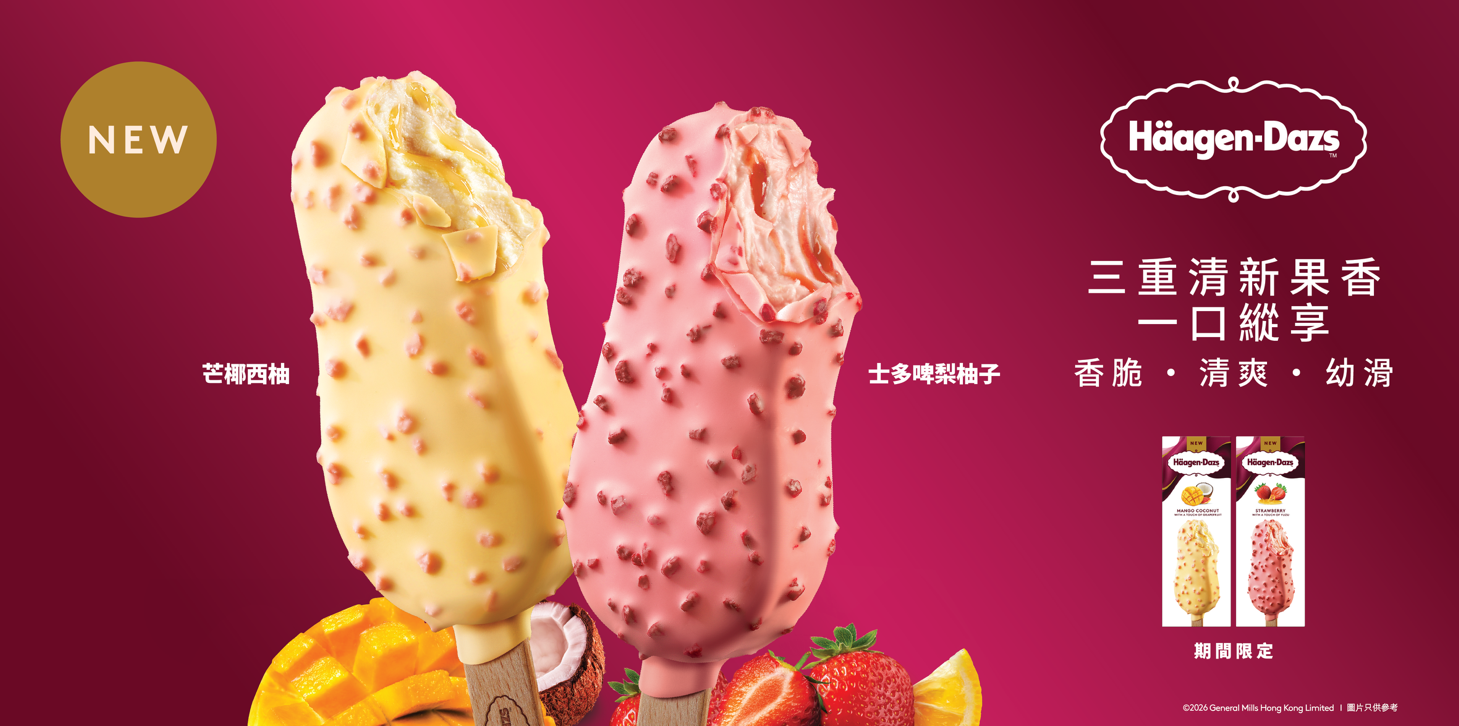 Häagen-Dazs™全新推出兩款期間限定果香脆皮雪糕批——「芒椰西柚脆皮雪糕批」及「士多啤梨柚子脆皮雪糕批」。
