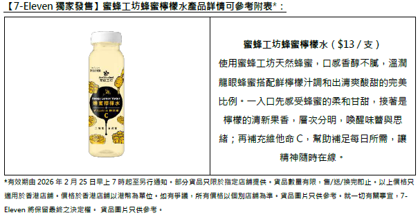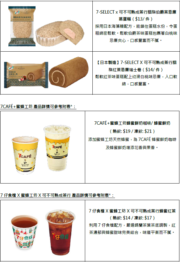 三大品牌聯乘,打造7-SELECT×蜜蜂工坊×可不可熟成茶行蜂蜜吉士紅茶包;7-SELECT與可不可熟成茶行聯手推出5款限定紅茶及伯爵茶系列新品;繼早前好評如潮的聯乘系列,另一自家品牌7CAFÉ再度與蜜蜂工坊攜手,帶來2款人氣蜂蜜飲品——7CAFÉ+蜜蜂工坊蜂蜜鮮奶咖啡及7CAFÉ+蜜蜂工坊蜂蜜鮮奶,由2月25日至3月10日,憑電子優惠券即可享有$11試飲優惠。7-Eleven獨家販售蜜蜂工坊蜂蜜檸檬水亦同場加映。
