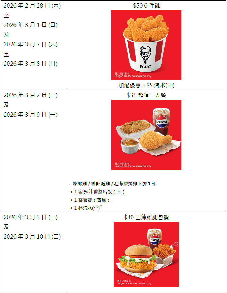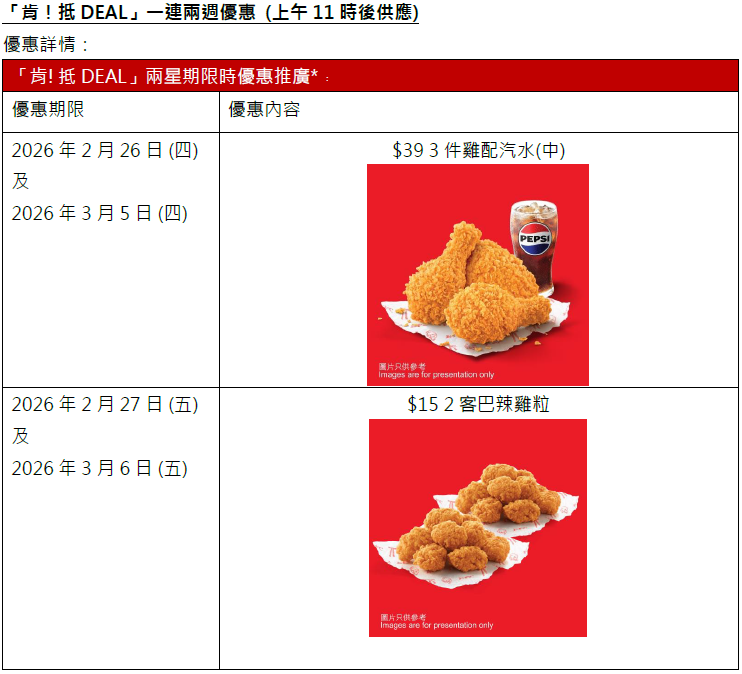 KFC「肯!抵DEAL」送上連續兩星期驚喜優惠,由2月26日(星期三)至3月11日(星期三),每日上午11時後均有不同主打抵DEAL輪流登場。