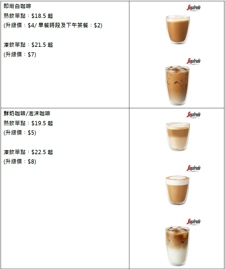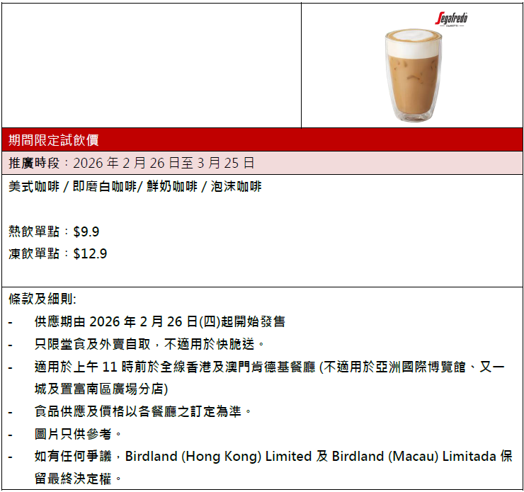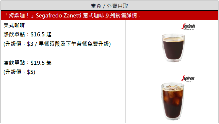 KFC全線分店現已引入意大利殿堂級咖啡品牌Segafredo Zanetti,2月26日至3月25日更有激抵「試飲價」$9.9起,讓你以超值價錢體驗國際級咖啡品質。此外,指定KFC分店2月26日首250位客人可以免費獲得一杯意式咖啡。(免費咖啡指定分店:黃埔花園、灣仔莊士敦道、APM、火炭山尾街、信德中心、長沙灣廣場、有餘貿易中心、新港城中心、波斯富街、奧海城、新世紀廣場、健威坊、美麗華廣場及海富中心)