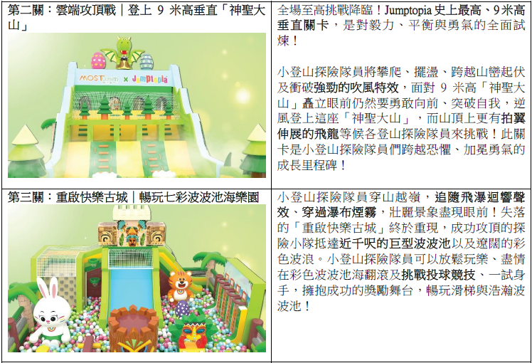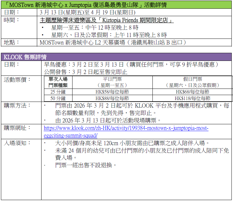 由3月13日至4月19日,MOSTown新港城中心與Jumptopia攜手呈獻「MOSTown新港城中心×Jumptopia復活島最勇登山隊」主題歷險彈床遊樂區。門票將由3月2日(星期一)起於KLOOK獨家發售,優惠票價低至HK$58;3月13日(星期五)或之前購買任何門票,更可享9折早鳥優惠。