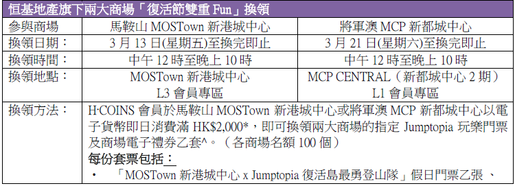 今個復活節假期,恒基地產旗下兩大商場馬鞍山MOSTown新港城中心及將軍澳MCP新都城中心攜手推出跨場消費獎賞「復活節雙重Fun」!活動推廣期內,H·COINS會員於MOSTown新港城中心或MCP新都城中心2期及3期場內以電子貨幣即日消費滿HK$2,000,即可換領兩大商場的指定Jumptopia玩樂門票及商場電子禮券乙套*。