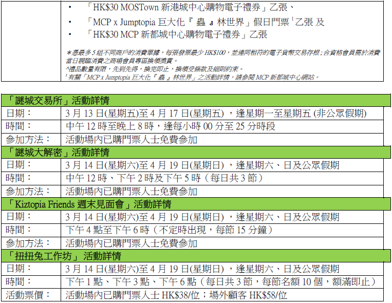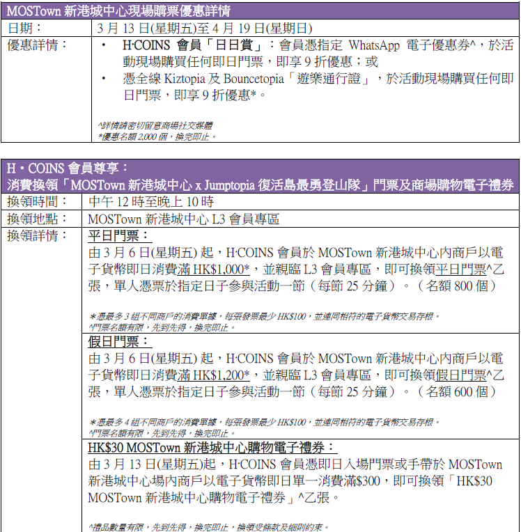 此外,由3月6日起,H·COINS會員於MOSTown新港城中心以電子貨幣即日消費滿指定金額,即可換領指定入場門票*乙張。此外,由3月13日起,會員憑指定WhatsApp電子優惠券,於活動現場購買任何即日門票,即享9折優惠;憑即日入場門票或手帶並於場內以電子貨幣即日單一消費滿HK$300,更可換領「HK$30 MOSTown新港城中心購物電子禮券」*乙張。