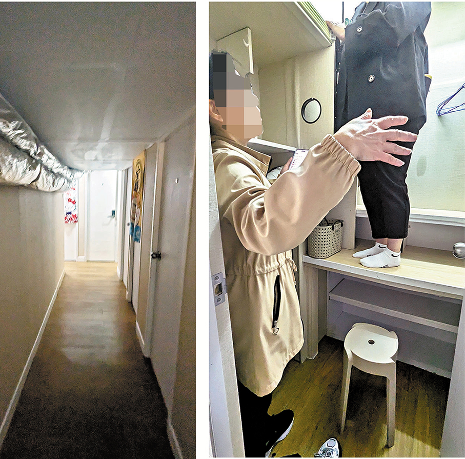 管理人當日帶記者參觀其中兩個單位,其中一間面積估計約60平方呎,無窗、空間逼仄,月租約2,800元;另一間則略大,估計不足80平方呎,同樣無窗,月租約3,500元。記者詢問無窗房間會否有消防安全隱患,或令住客感到壓抑,他僅稱「沒問題,住習慣就好了。」當被問及房間實際面積時,他則稱「看起來多大就是多大」,似乎有意迴避標準問題。