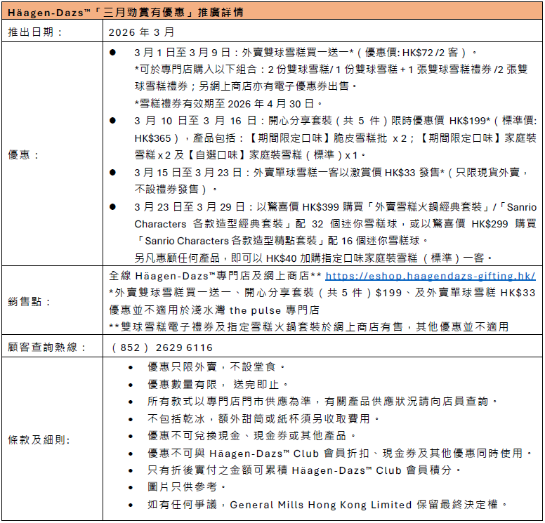 Häagen-Dazs™由3月1日起精心呈獻「三月勁賞有優惠」,一連四星期帶來5重驚喜禮遇。由3月1日至3月9日,Häagen-Dazs™外賣雙球雪糕買一送一(HK$72),可於網上商店同步選購電子禮券,換領券有效期至4月30日;由3月10日至3月16日,Häagen-Dazs™開心分享套裝低至55折;由3月15日至3月23日,Häagen-Dazs™專門店限時推出優惠,只需HK$33(標準價HK$55),即可享用外賣單球雪糕一客。