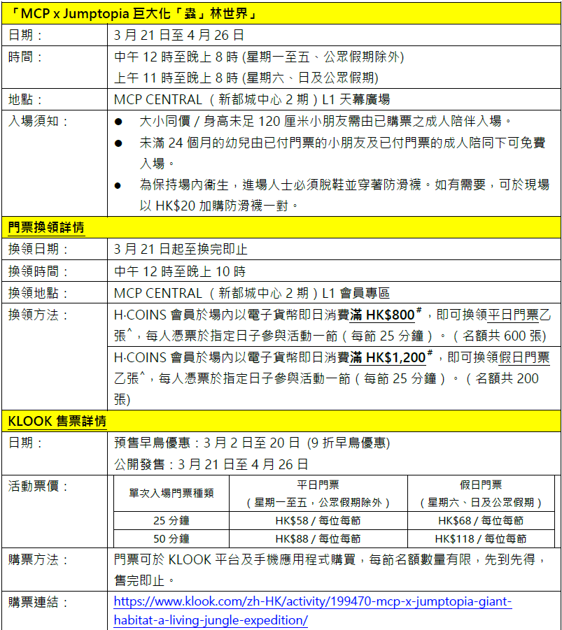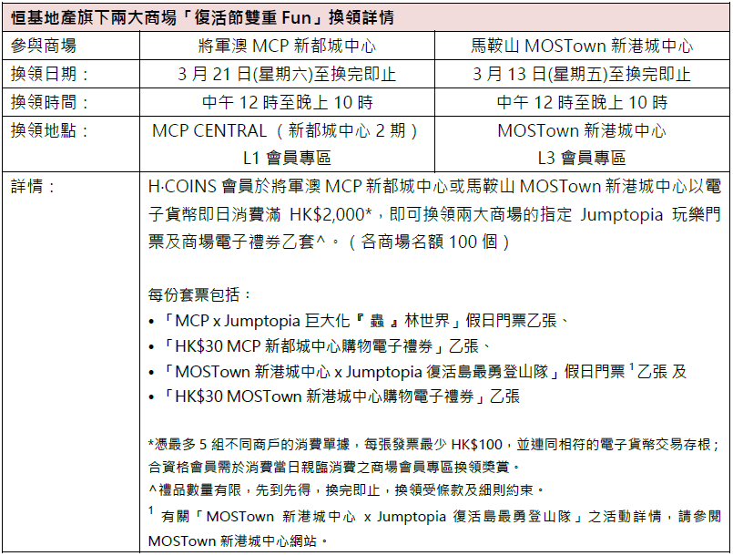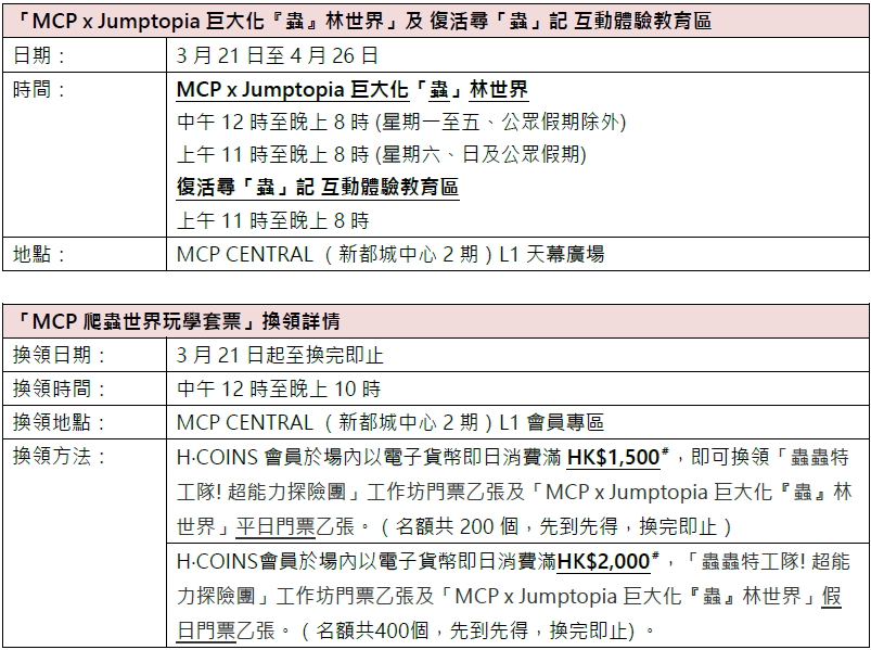 MCP新都城中心特設H‧COINS會員獨家換領,會員於商場內消費滿指定金額,可換領「MCP爬蟲世界玩學套票」。套票包括「MCP×Jumptopia巨大化『蟲』林世界」門票及「蟲蟲特工隊!超能力探險團」工作坊門票。H‧COINS會員尊享「復活節雙重Fun」跨場消費獎賞,由3月21日起,會員於MCP新都城中心2期及3期或MOSTown新港城中心場內以電子貨幣即日消費滿HK$2,000,即可換領指定Jumptopia玩樂門票及商場電子禮券乙套。