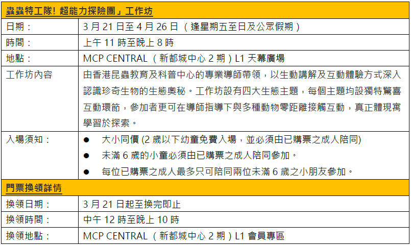3月21日至4月26日,MCP新都城中心更與香港昆蟲教育及科普中心攜手呈獻「MCP復活尋『蟲』記」昆蟲探索展,每逢星期五至日及公眾假期,「蟲蟲特工隊!超能力探險團」工作坊誠邀大小朋友化身「蟲」林特工隊,在專業導師帶領下展開一場25分鐘的超能力探險之旅。有別於周末的工作坊場次,「MCP復活尋『蟲』記」互動體驗教育區於星期一至四特設「蟲林導賞團」團體包場導賞服務,專為學校、社福機構及各類團體度身而設,可提前預約。