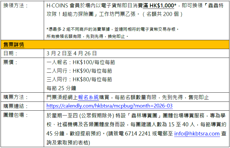 「巨大化『蟲』林世界」充氣樂園門票將由3月2日起於KLOOK獨家發售,優惠票價低至HK$58,3月20日前預購門票更可享9折早鳥優惠;「蟲蟲特工隊!超能力探險團」工作坊,由3月2日起經網上購票系統發售,三人同行報名票價更低至每位HK$80。