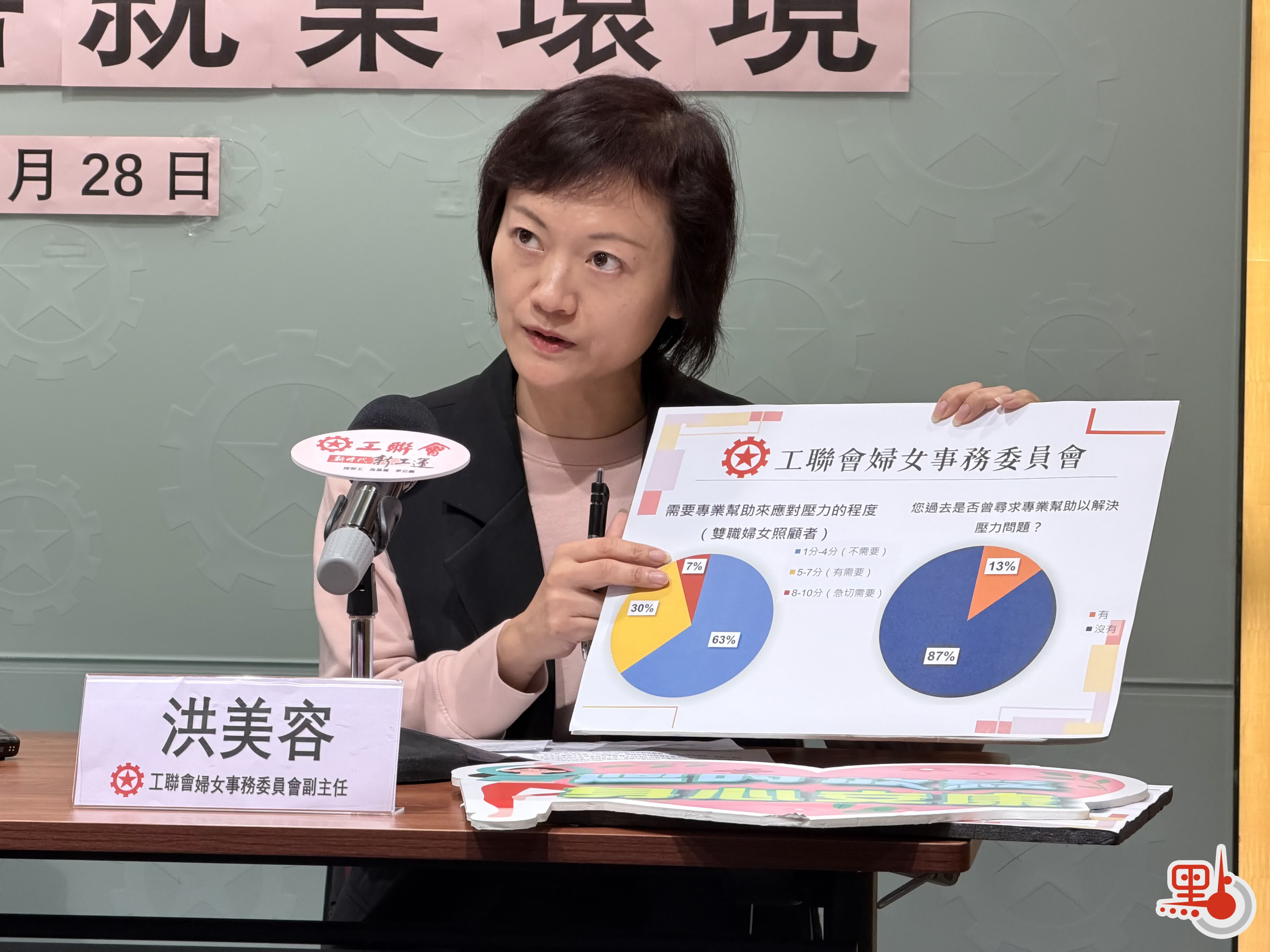 工聯婦委副主任洪美容表示,大部分婦女即使有需要亦未尋求專業幫助。調查顯示,儘管37%受訪雙職女性表示需要專業幫助,但卻只有13%曾尋求家庭指導、社工、心理輔導或精神科等專業服務;表示急切需要幫助的受訪者普遍認為「財政開支」和「缺乏時間」是阻礙主因,亦有受訪者認為公營服務輪候時間過長及會診時間太短、私家專科費用難以負擔是主要阻力。