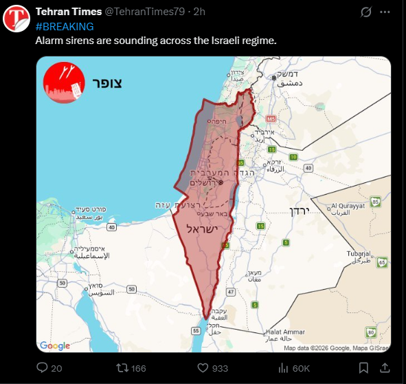 以色列政府監測到伊朗發射導彈,要求民眾立即進入避難設施。以色列多地響起防空警報,特拉維夫街頭民眾正在奔跑進入避難設施。隨後,以色列北部響起爆炸聲,並響起防空警報。