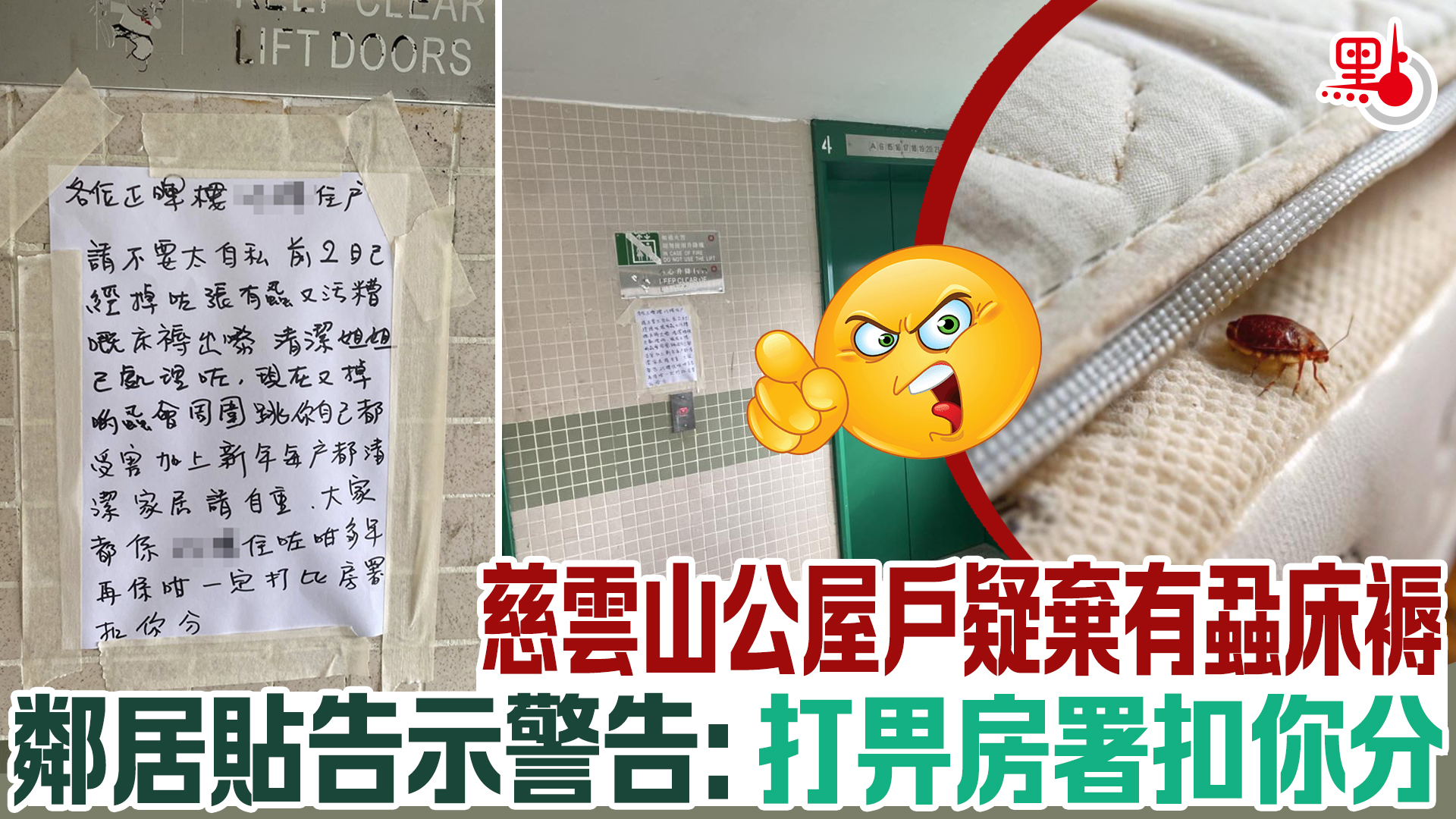 【點新聞報道】遇上無公德心鄰居,會令人很困擾。慈雲山慈正邨有住戶在升降機旁邊牆壁貼上手寫告示,怒指同層鄰居棄置「有蝨又污糟嘅床褥」,並警告「再係咁,一定打畀房署扣你分」。帖文引起網民熱議,「依家啲人自私自利,全冇公德心」、「新年流流搞啲咁嘅嘢」。