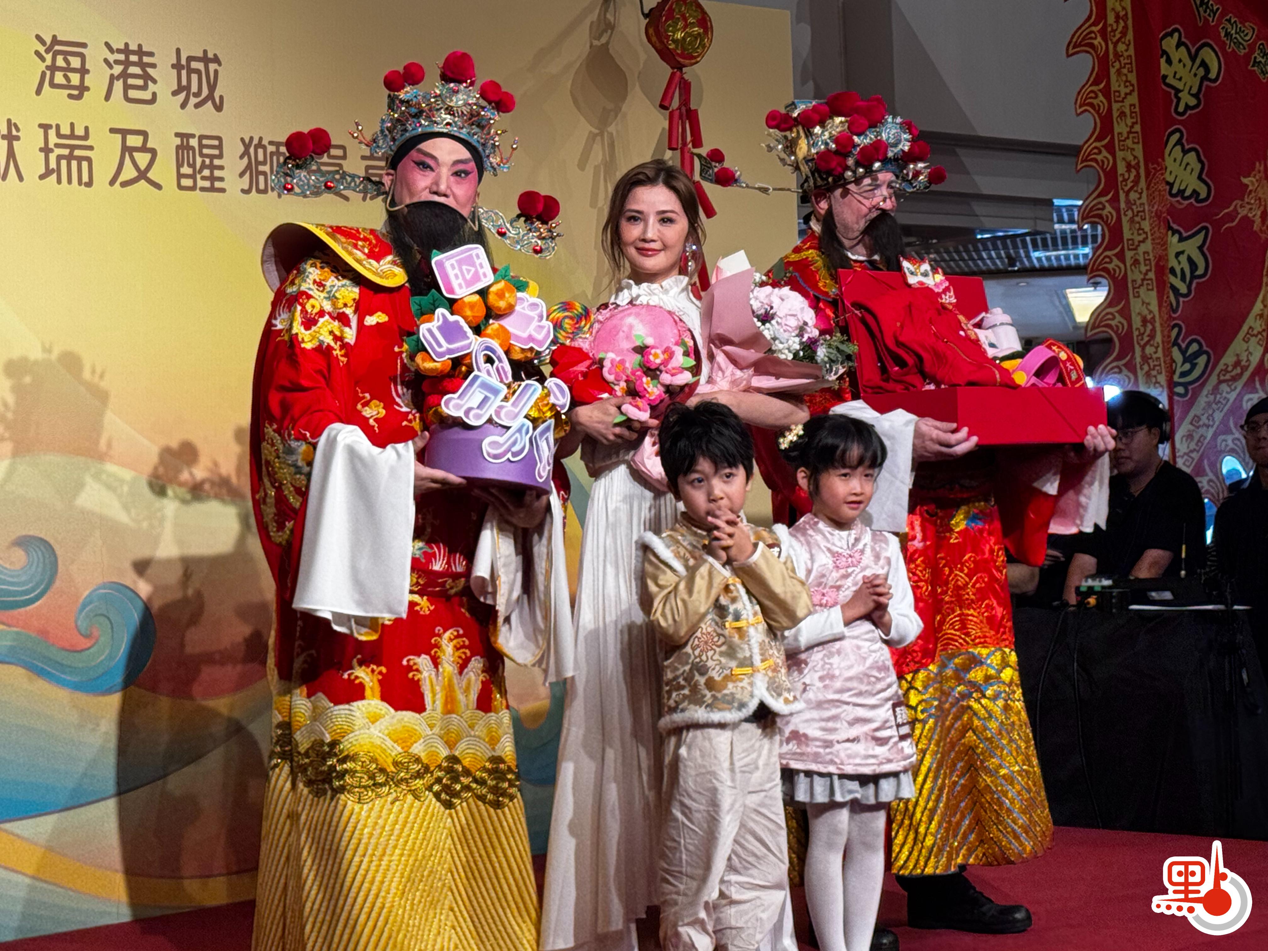 送禮環節上,海港城為阿Sa準備了3份別具心思的禮物:西財神送上運動衫及按摩槍,祝願她身壯力健;中財神送上桔仔樹擺設及金元寶,寓意發財旺事業;兩位小朋友則送上粉紅浴球及朱古力,祝福她生活甜蜜美滿。阿Sa與財神及小朋友們溫馨合照,歡笑連連。最後,阿Sa聯同凌緣庭女士一同敲響銅鑼、燃放爆竹。兩人亦為金龍及醒獅主持點睛儀式。