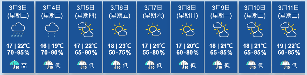 天文台表示,受冷鋒隨後的東北季候風影響,未來一兩日廣東地區天氣轉涼,而高空擾動亦會為該區帶來有雨的天氣。本港明日間中有驟雨,天氣轉涼,氣溫逐步下降至16、17度左右。當中星期三(3月4日)仍有幾陣雨及清涼。受較乾燥的季候風補充影響,本周後期及周末期間華南天色逐漸好轉。