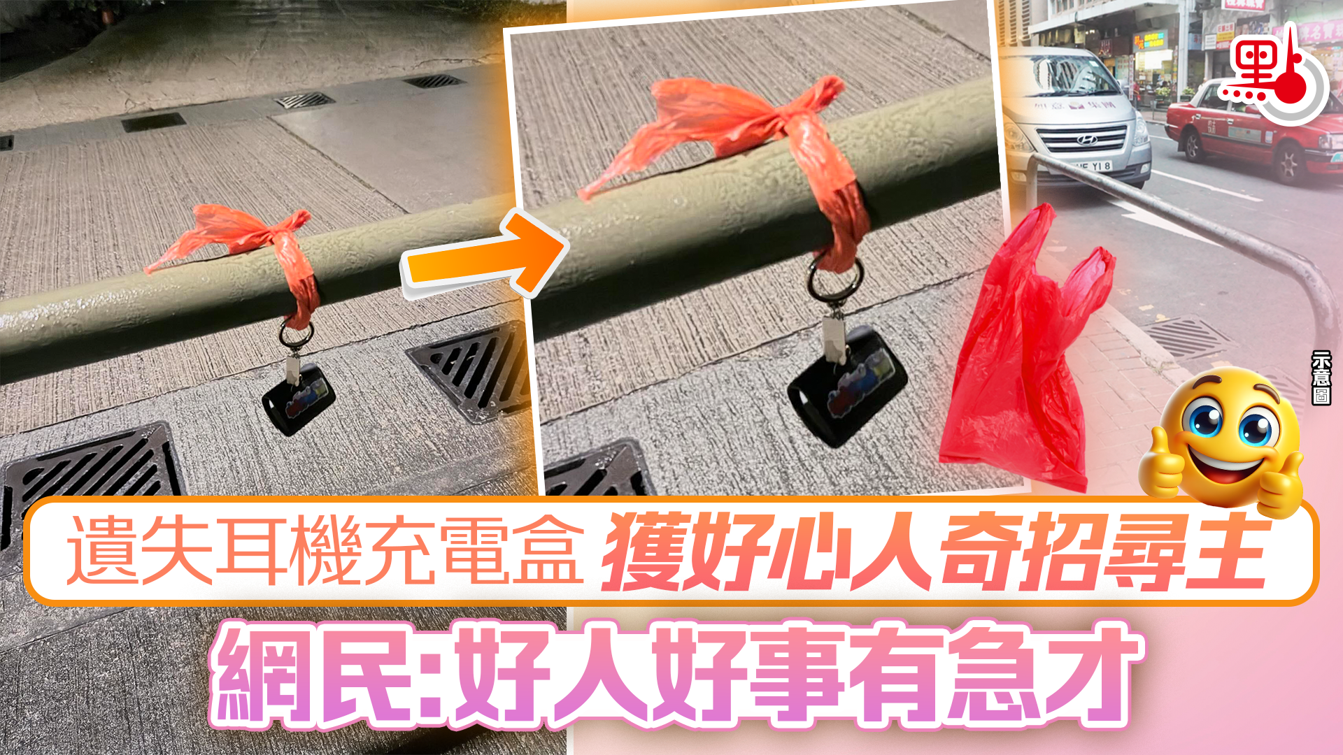 該網民於社交平台上傳照片,指「返到屋企發現個case(耳機充電盒)唔見咗」,隨即開啟查找功能「睇下喺邊」。事主發現「佢喺屋企附近,9秒9衝咗出去,一去到見到有好心人幫我綁咗佢喺路邊」。從事主上傳的相片中可見,一個黑色方形物件被疑似是紅色膠袋綁在路邊的欄桿上,而黑色方形物件則懸掛在欄桿下方。樓主推測,「佢應該係喺膠袋撕咗一忽落嚟綁住」。事主滿心感謝:「感謝好心人,祝你去廁所永遠有紙巾」。