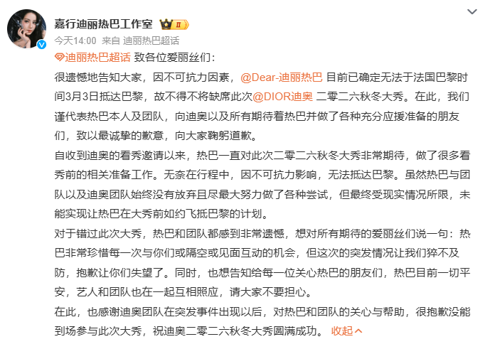 工作室帖文稱,「因不可抗力因素」,迪麗熱巴目前已確定無法於法國巴黎時間3月3日抵達巴黎,因此不得不缺席DIOR迪奧2026秋冬大秀。工作室向品牌方及粉絲致歉,並且強調迪麗熱巴目前一切平安,藝人和團隊也在一起互相照應,請大家不要擔心。