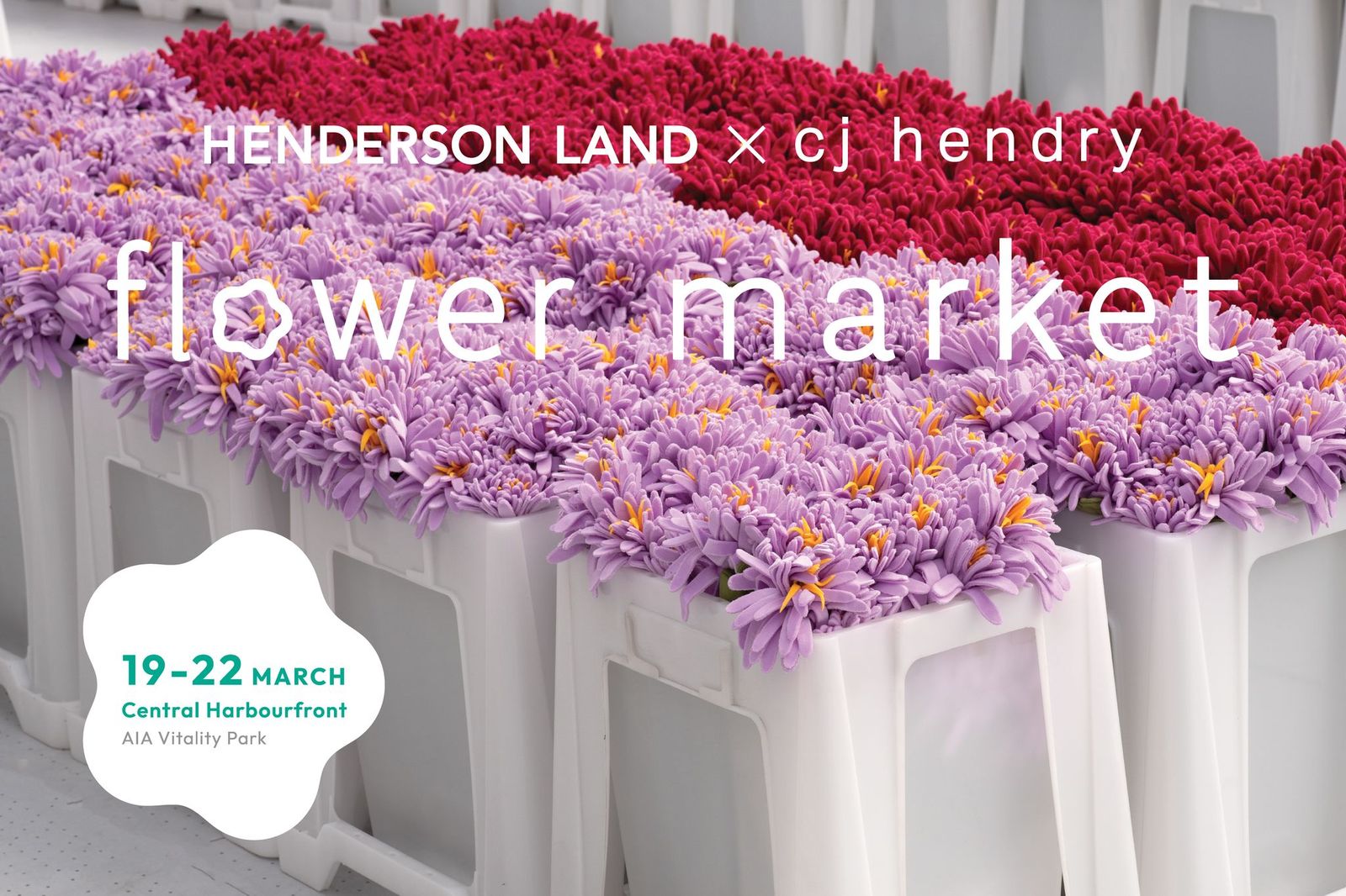 「Henderson Land x Cj Hendry Flower Market」將於2026年3月19日至22日,一連四日於中環海濱免費向公眾開放。所有入場人士必須透過活動網站進行預先登記,並憑電子門票方可入場。