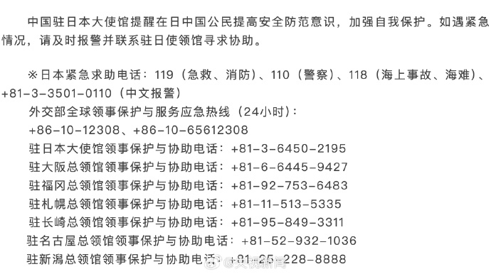 駐日使館提醒在日同胞應增強安全意識,避免前往人員複雜和治安混亂區域。經過擁堵繁忙人流密集區域時應提高警惕,盡量與他人保持安全距離,看護好隨行老人或小孩。尤其注意早晚通勤高峰時段,在車站通道及出入口、電扶梯、樓梯、人行橫道等擁堵區域,不要邊走邊看手機,留意身邊情況。