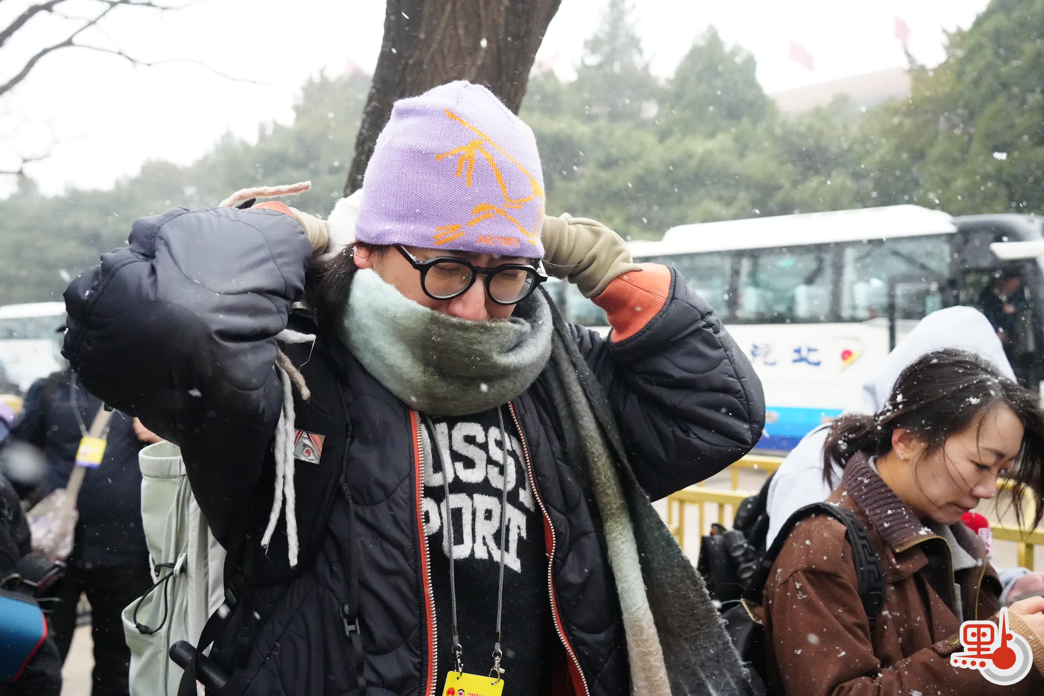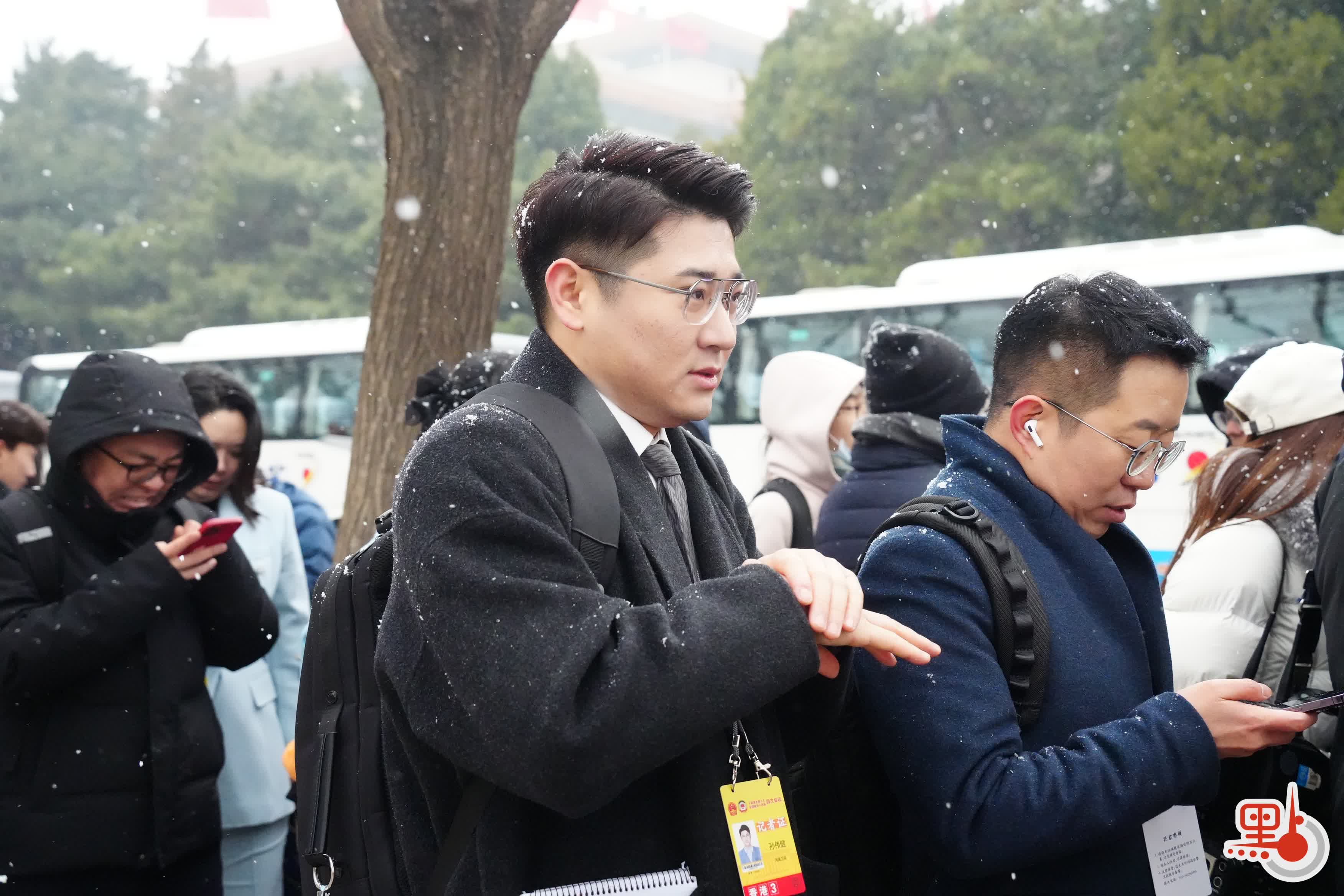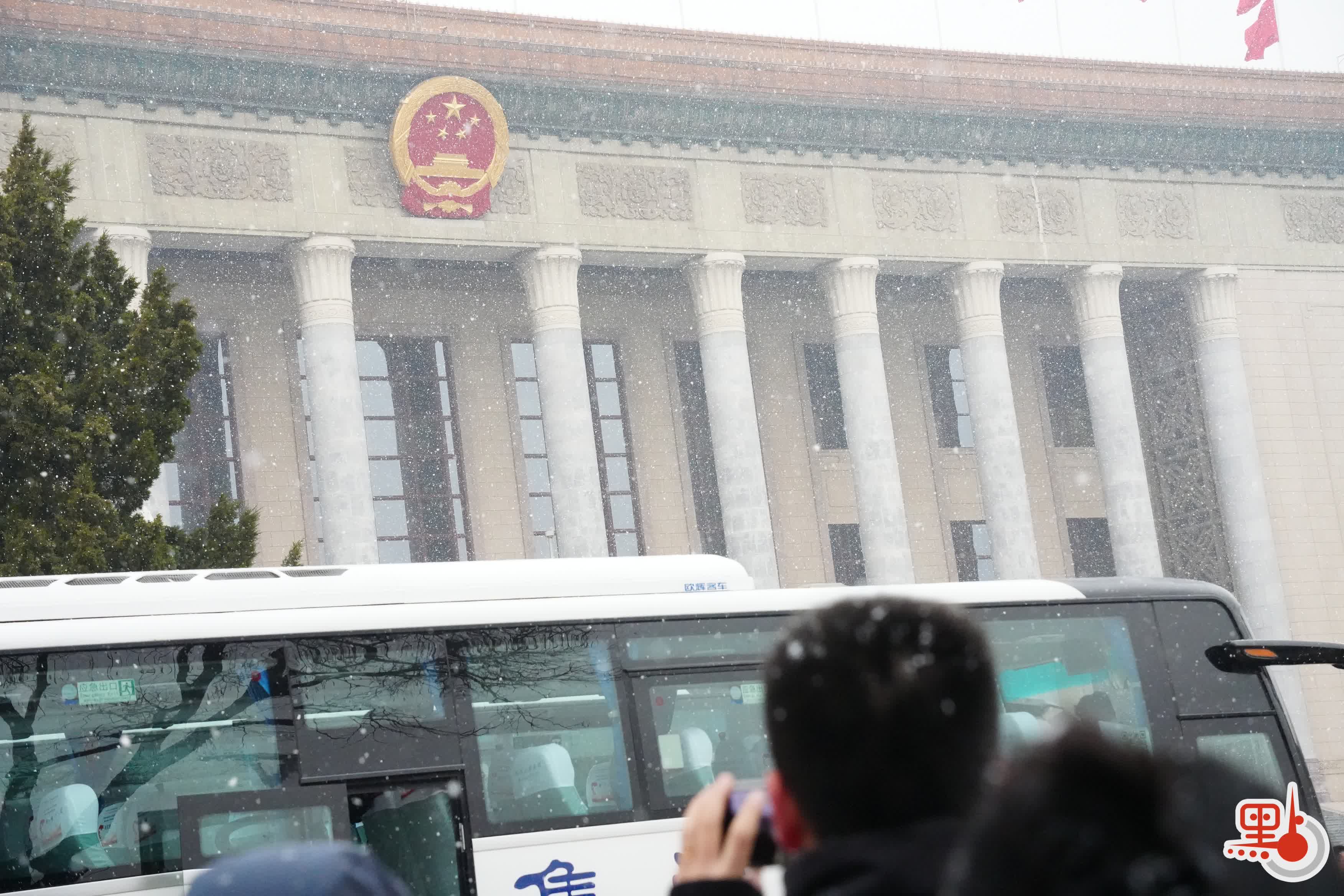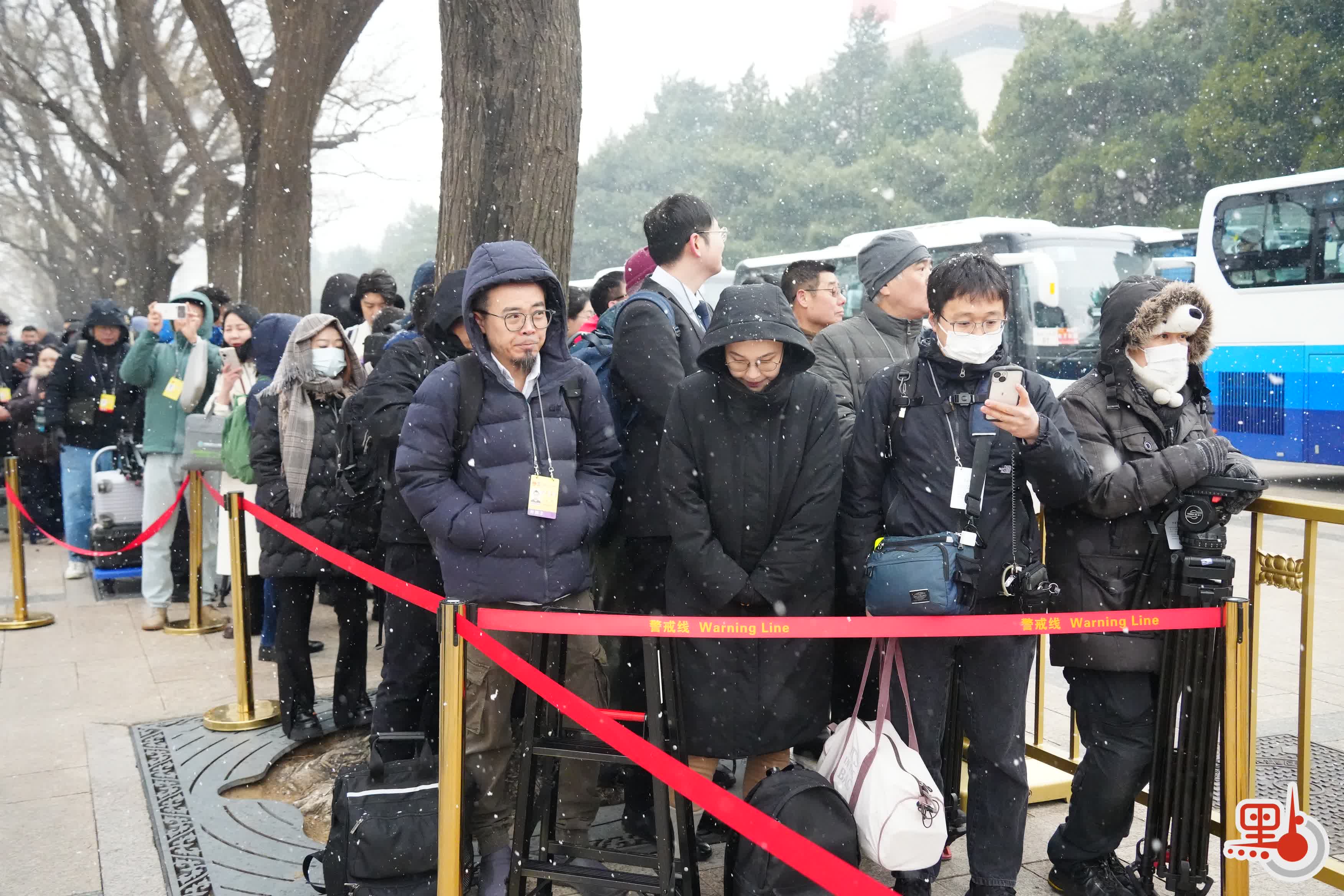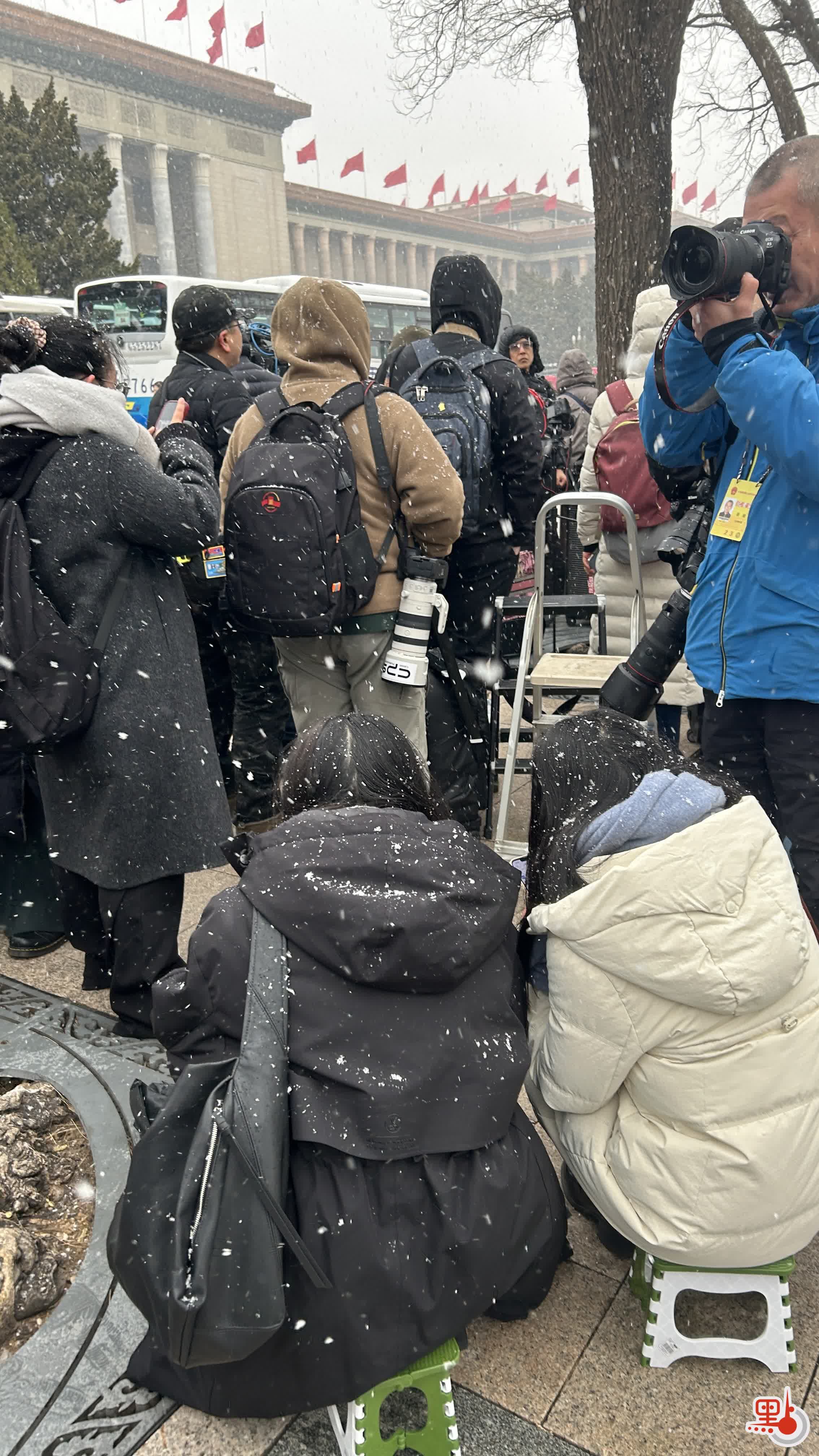今日上午11時許,點新聞記者在人民大會堂外看到,天空中飄起鵝毛大雪,雪愈下愈大,許多媒體從業者在外等候入場,頭髮上與背包上落滿了雪。除此之外,場外的武警官兵、交警與軍犬亦在雪中守護秩序。