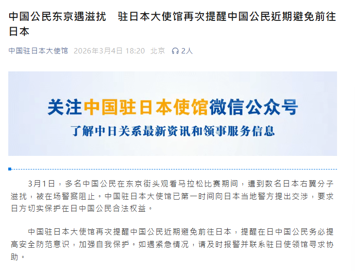 【點新聞報道】據中國駐日本大使館微信公眾號3月4日消息,3月1日,多名中國公民在東京街頭觀看馬拉松比賽期間,遭到數名日本右翼分子滋擾,被在場警察阻止。中國駐日本大使館已第一時間向日本當地警方提出交涉,要求日方切實保護在日中國公民合法權益。