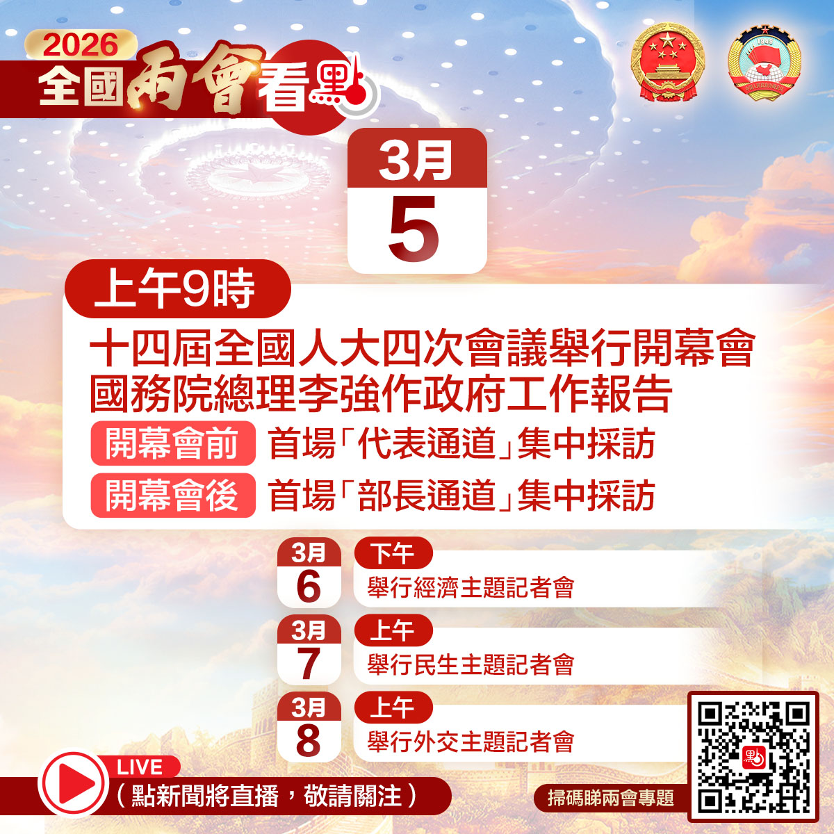【點新聞報道】全國兩會時間今日(4日)正式開啟。全國兩會每天都有哪些看點?快來一圖睇清!