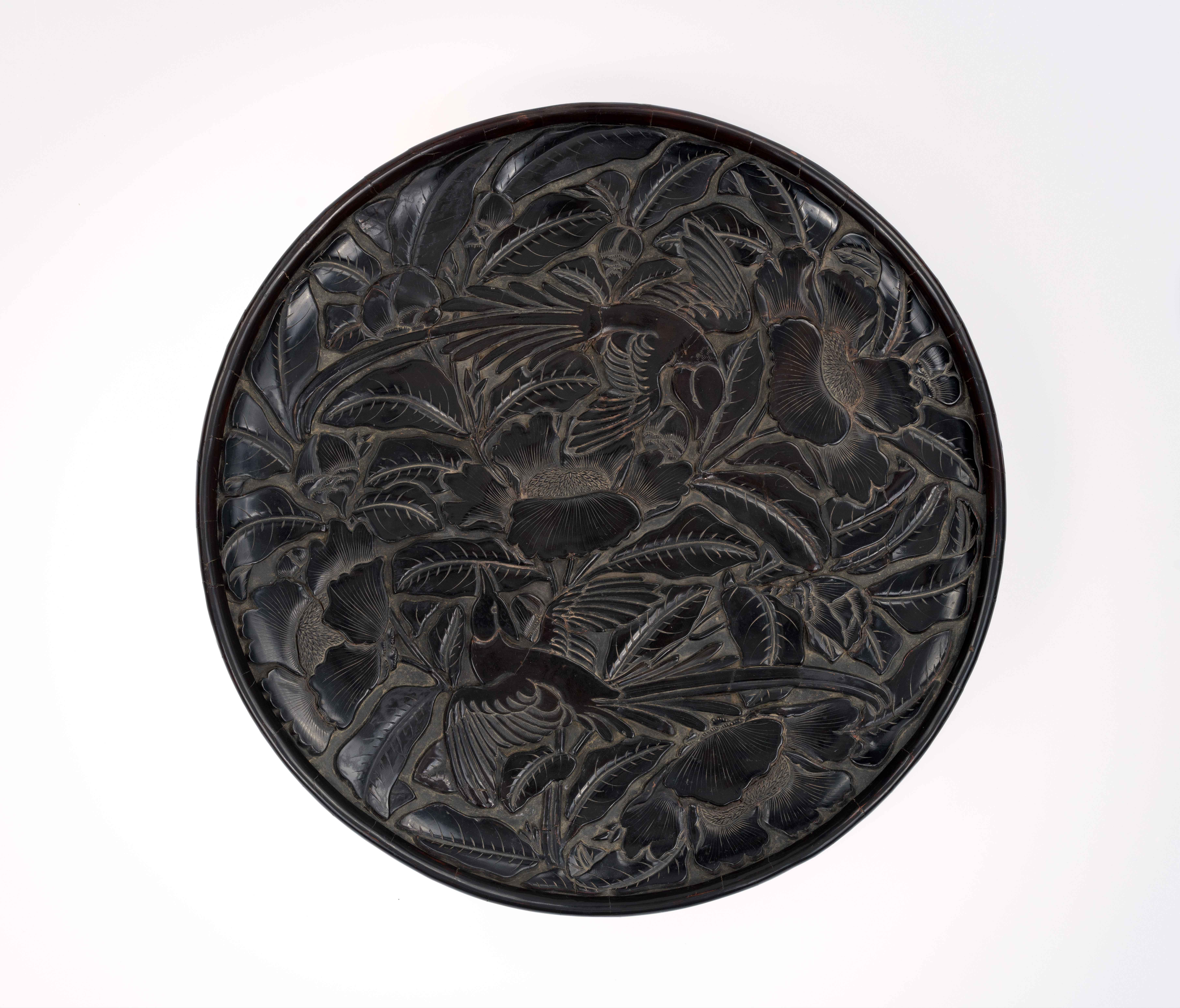 元至明代(1271—1644)剔黑(黑色雕漆)雙鳥穿花紋圓盤,此為「一年景」單元的展品。