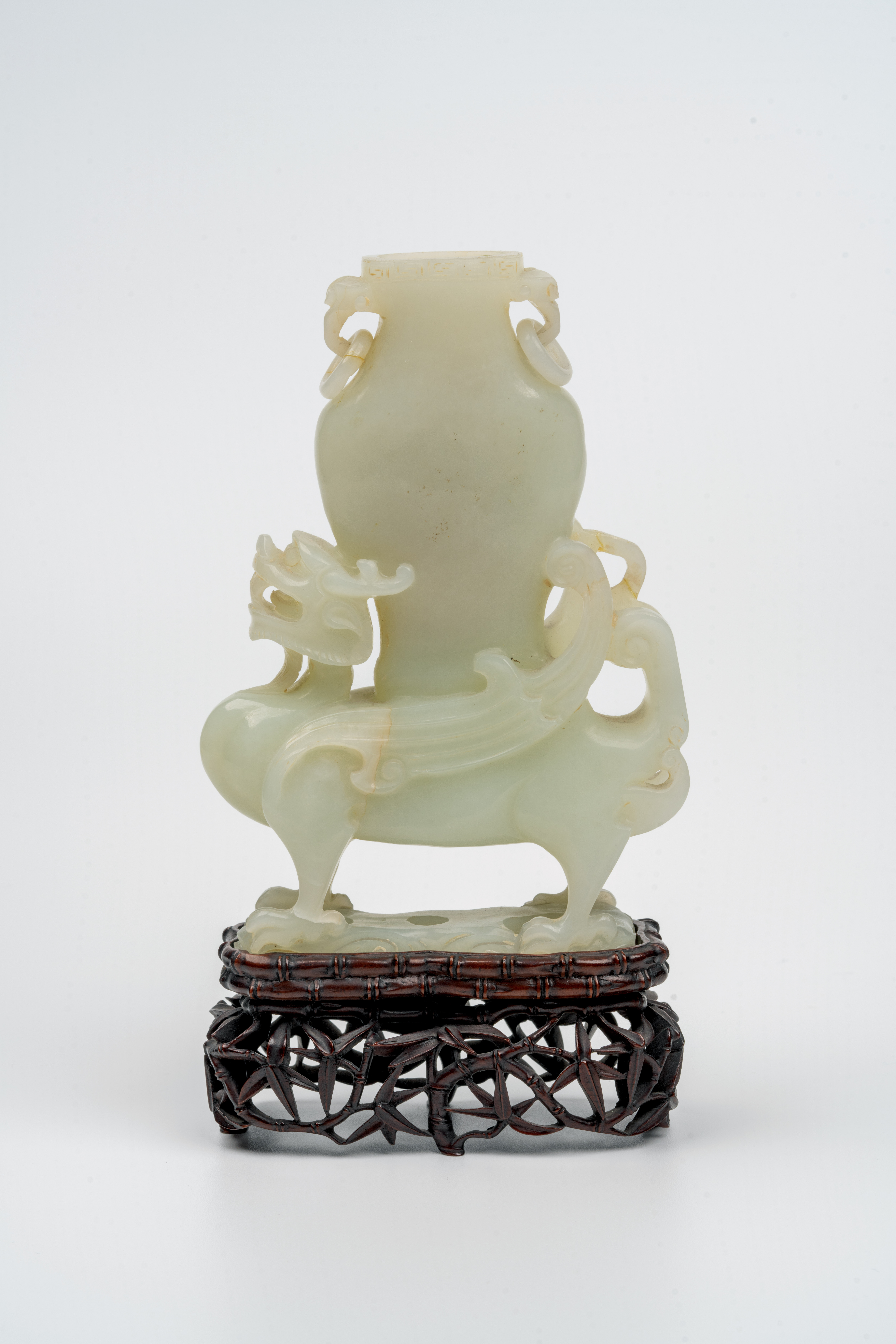 清代(1644—1911)玉神獸馱瓶,此玉瓶是「未央」單元的展品。