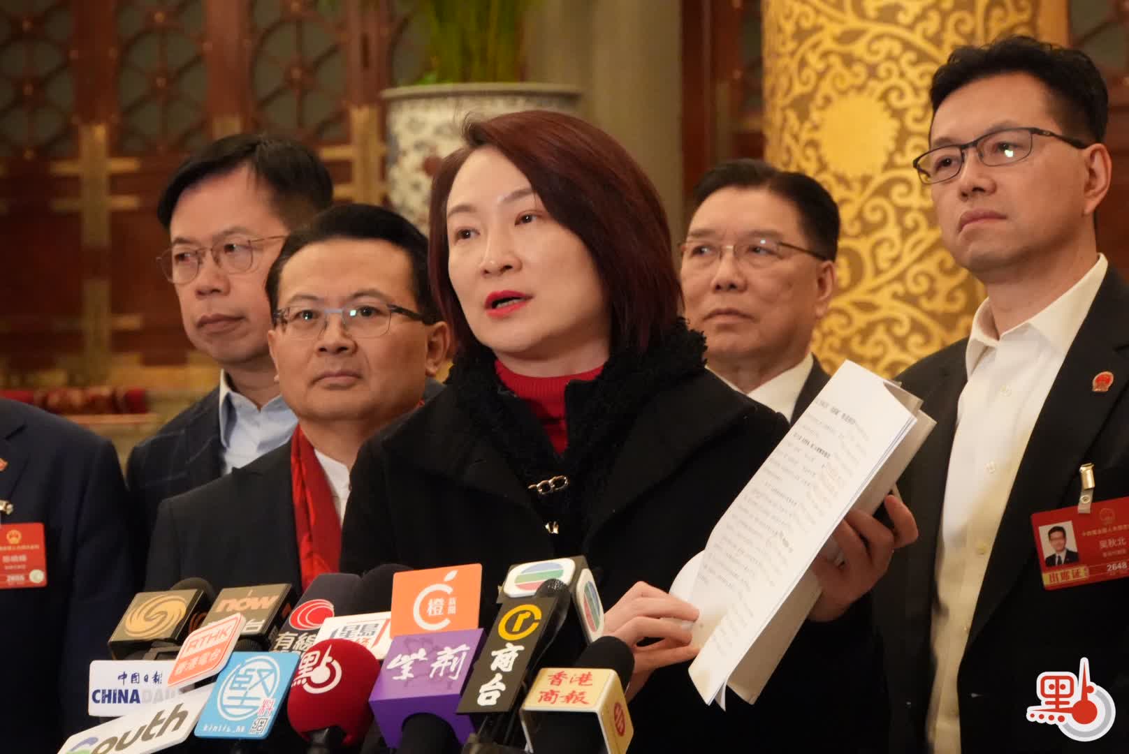全國人大常委會委員、香港第八屆立法會主席李慧琼隨後發言,她說,今日聽取李強總理作政府工作報告感到振奮,形容是一份「承上啟下、穩中求進、以新促質、以民為本」的好報告。其中,政府工作報告明確指出支持香港更好融入和服務國家發展大局,令她深切感受到中央對香港的關懷與厚愛。另外,她表示,特區政府將制定首個五年規劃,這具有里程碑意義,立法會將全力配合特區政府,開展科學調研,確保香港規劃與國家「十五五」規劃緊密銜接,在國家發展大局中找準定位、發揮作用。她向現場傳媒展示手中的「十五五」規劃草案,清晰可見已劃許多重點。她說,草案有專章提及港澳,包含支持港澳鞏固提升競爭優勢、支持港澳更好融入及服務國家發展大局,相關內容對香港制定首個五年規劃具有重大的參考和指導意義。