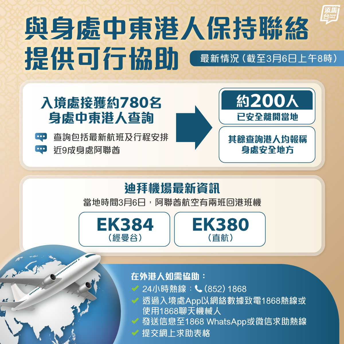 政府又指,根據迪拜機場最新資訊,當地時間3月6日阿聯酋航空有兩班回港班機,分別是經曼谷的EK384,以及直航航班EK380。自迪拜機場有限度復航後,特區政府駐迪拜經貿辦人員協助當地港人理順離境安排,亦到場支援及協助港人。