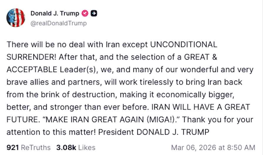 當天早些時候,美國總統特朗普在社交媒體發文稱,除了「無條件投降」之外,美國不會與伊朗達成任何協議。對此,萊維特解釋稱,所謂「無條件投降」,是指當美方認定伊朗已不再構成威脅,且軍事行動目標全部實現時,無論伊朗方面是否公開作出這一表態,伊朗實際上將處於「無條件投降」狀態。