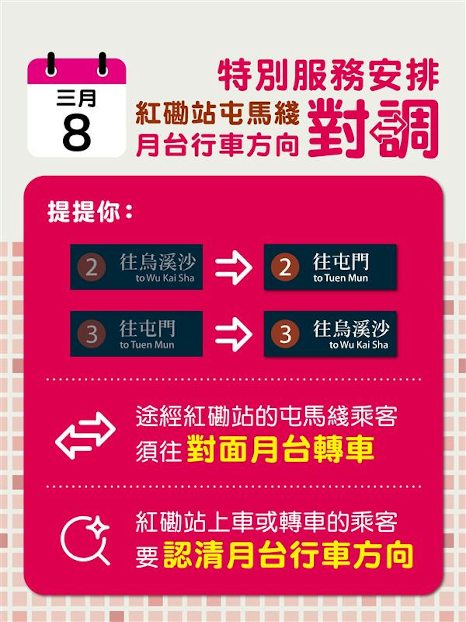 而在紅磡站入閘乘搭屯馬綫,或在紅磡站東鐵綫轉乘屯馬綫的乘客,登車前務必留意月台行車方向:紅磡站屯馬綫月台列車行駛方向與平日不同,紅磡站屯馬綫2號及3號月台的列車行駛方向與平日對調,2號月台列車將改為往屯門站方向,3號月台列車則改往烏溪沙站方向。