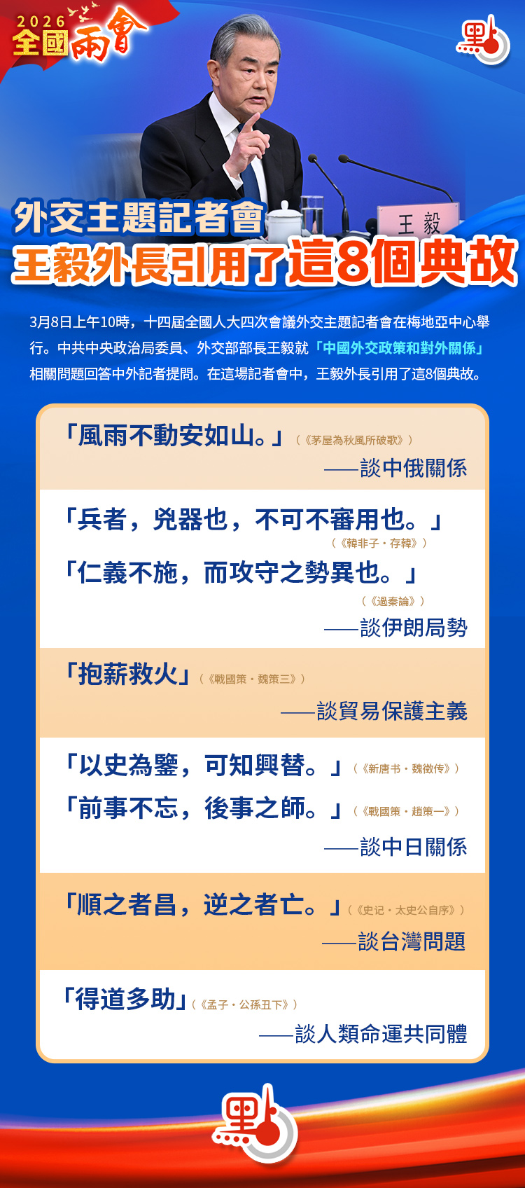 【點新聞報道】3月8日上午10時,十四屆全國人大四次會議外交主題記者會在梅地亞中心舉行。中共中央政治局委員、外交部部長王毅就「中國外交政策和對外關係」相關問題回答中外記者提問。在這場記者會中,王毅外長引用了這8個典故。