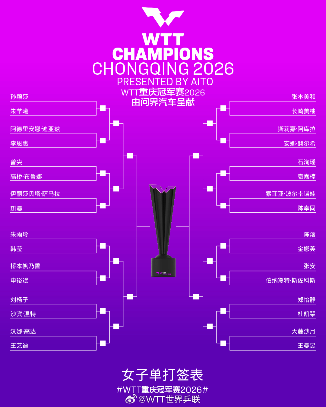 【點新聞報道】WTT重慶冠軍賽2026將於3月10日至15日開賽。3月8日,男女單打簽表出爐。