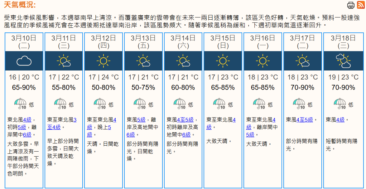 天文台指,受東北季候風影響,本周華南早上清涼。而覆蓋廣東的雲帶會在未來一兩日逐漸轉薄,該區天色好轉,天氣乾燥。預料一股達強風程度的季候風補充會在本周後期抵達華南沿岸,該區風勢頗大。隨着季候風稍為緩和,下周初華南氣溫逐漸回升。