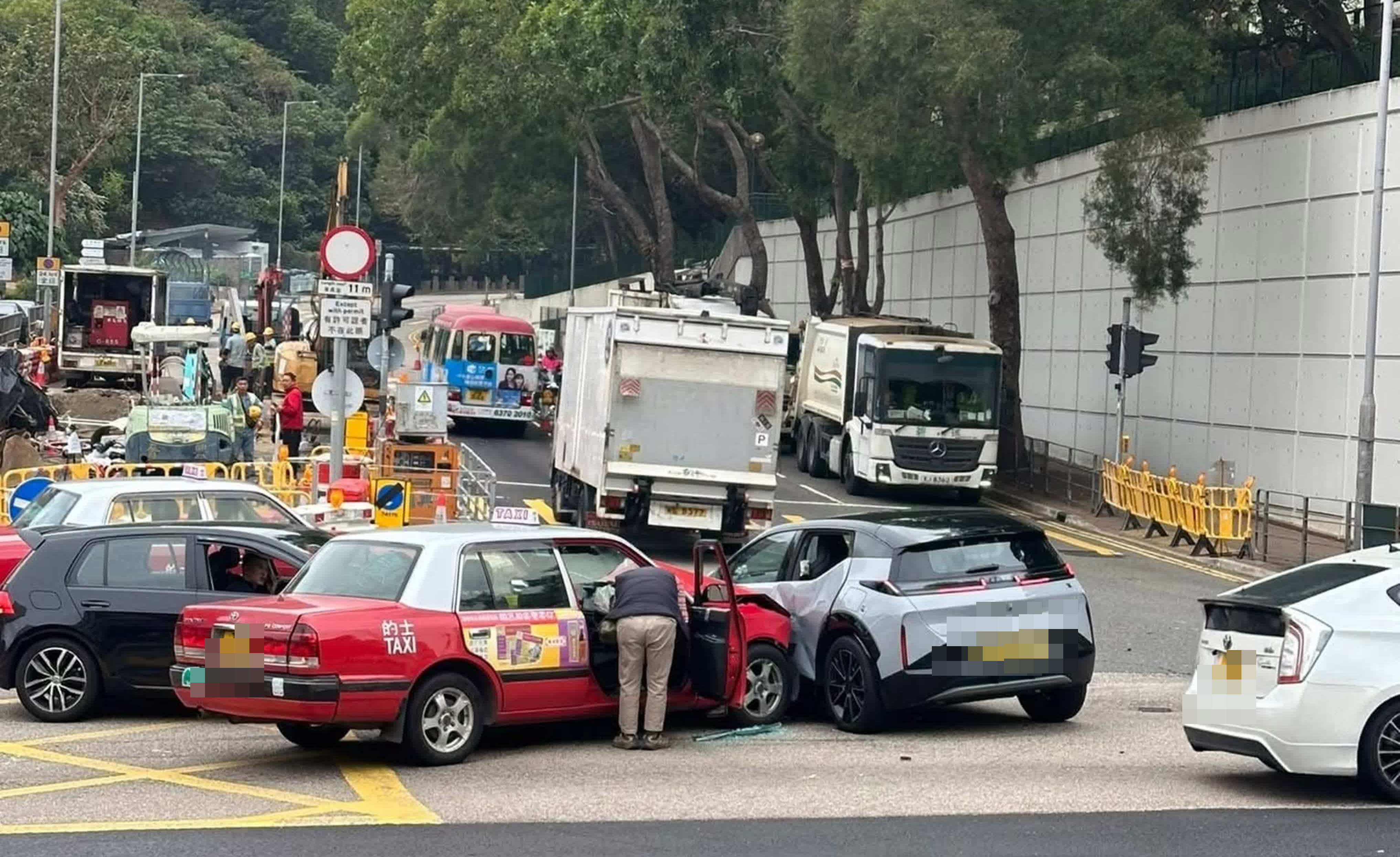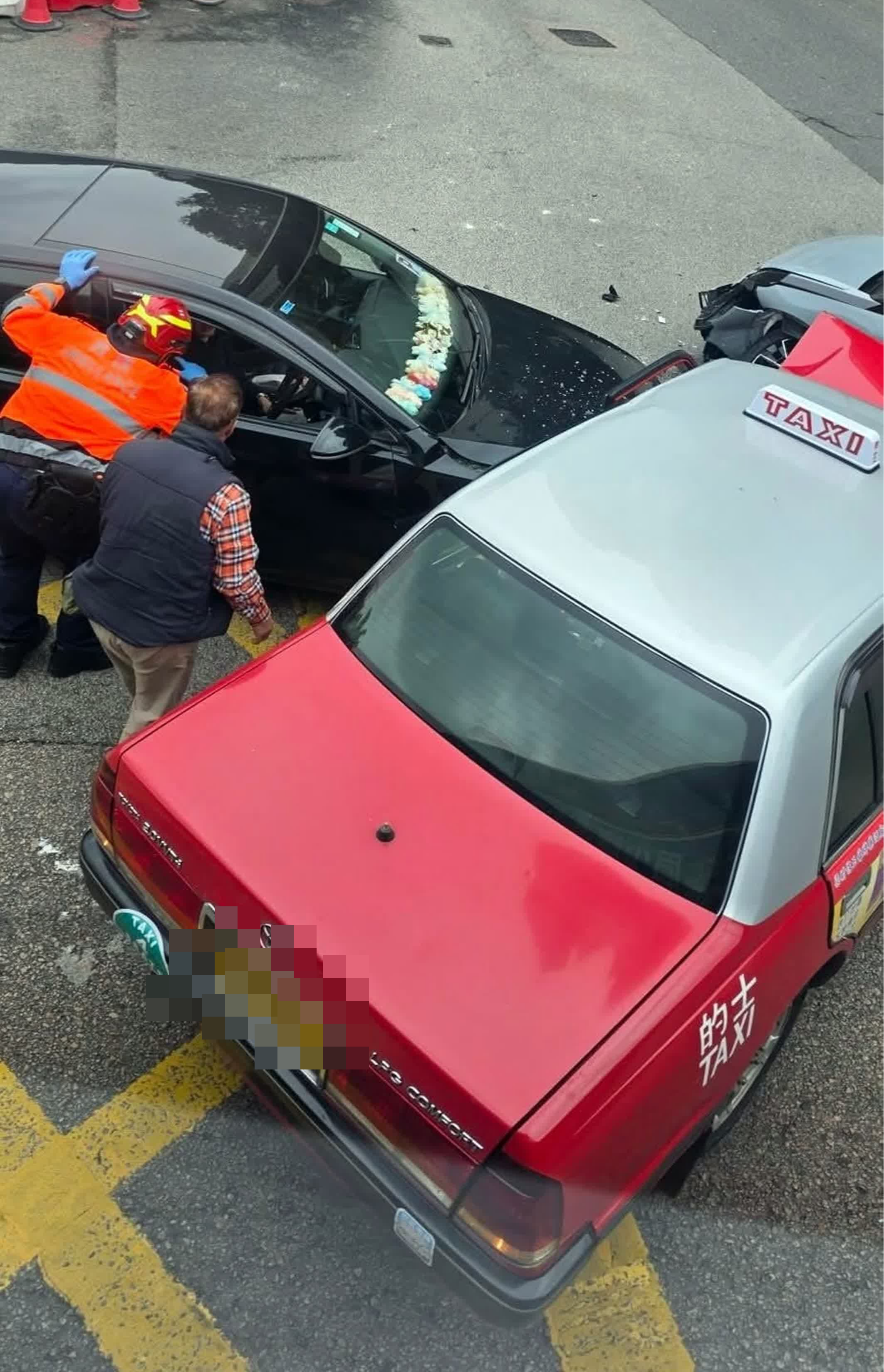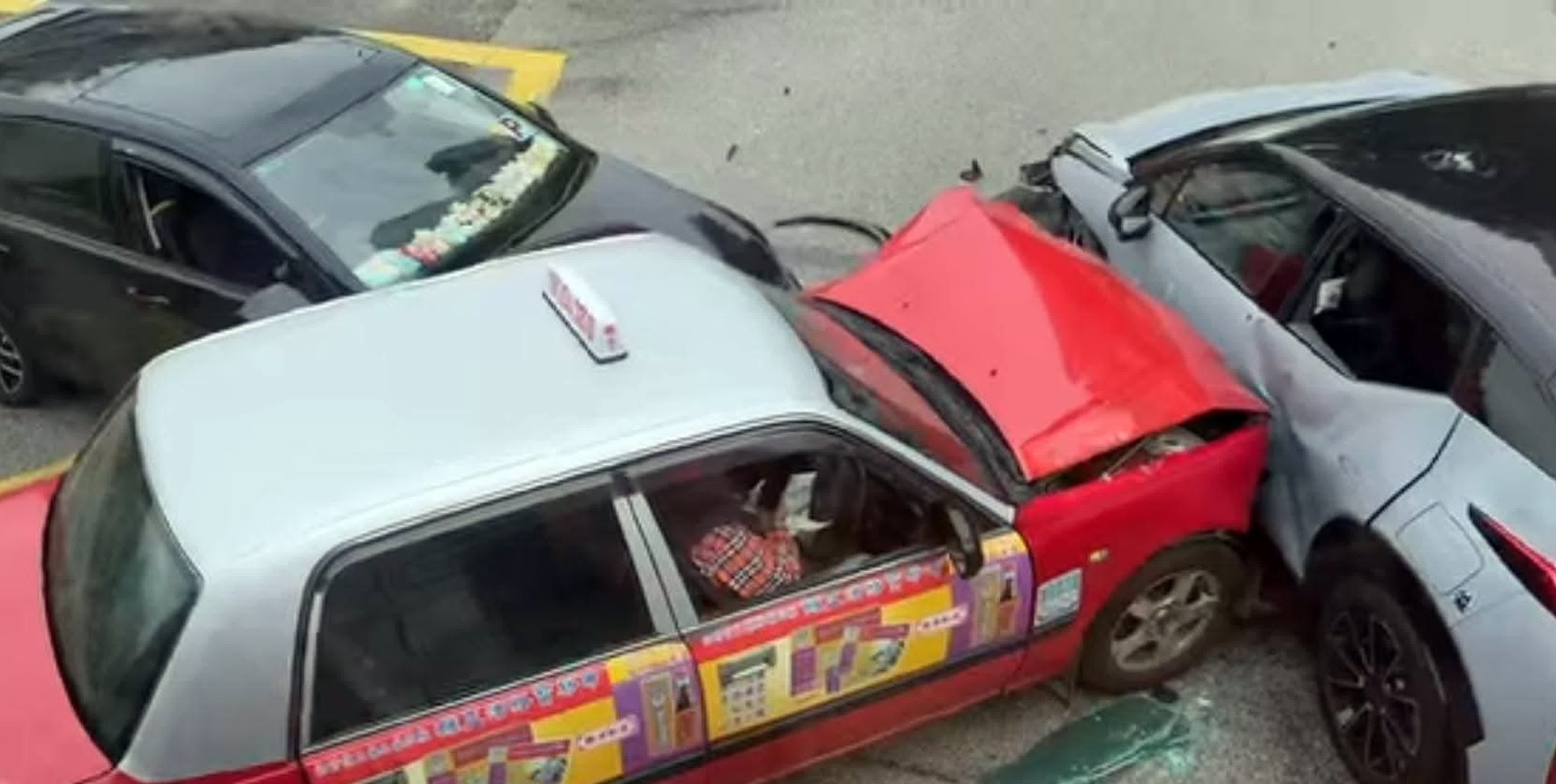 由網上片段可見,失事的士車頭及左邊車身損毀,其中一輛私家車損毀較嚴重,左邊車身凹陷,左後方車窗爆裂,玻璃碎滿地。受意外影響,現場交通一度受阻。警員正調查意外原因。