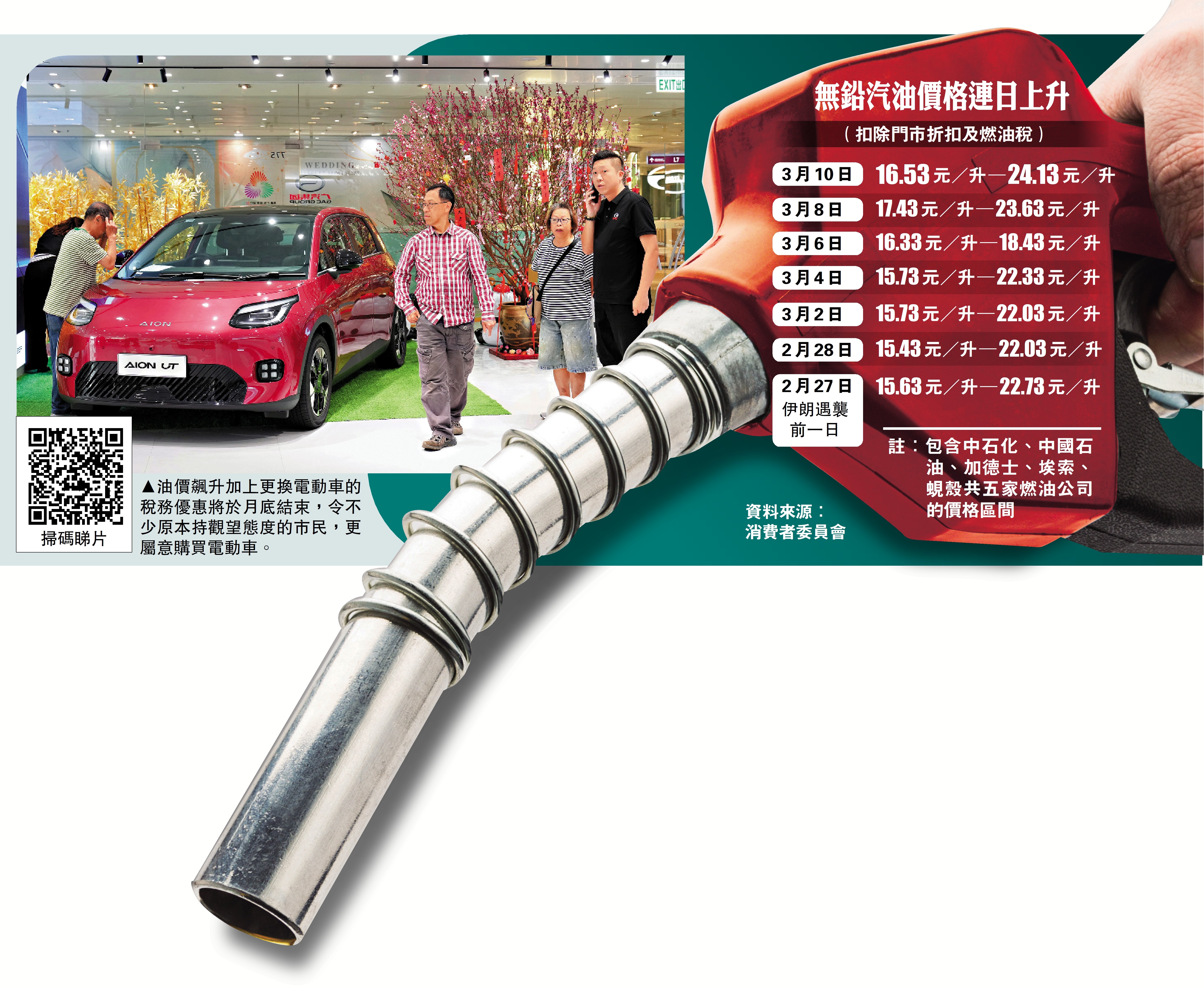 近期中東戰局持續緊張,帶動國際油價節節攀升,香港也無法幸免,昨日(3月11日)各油站汽油零售價已升穿每公升30元。消委會油價資訊通網頁資料顯示,在伊朗受襲前一天(2月27日),本港五間油公司每公升無鉛汽油油價,扣除門市折扣及燃油稅後,介乎15.63至22.73元之間,至前日(3月10日)共11日期間,五間油公司各加價三至四次、升到16.53至24.13元,加幅約為5.4%至8.4%。