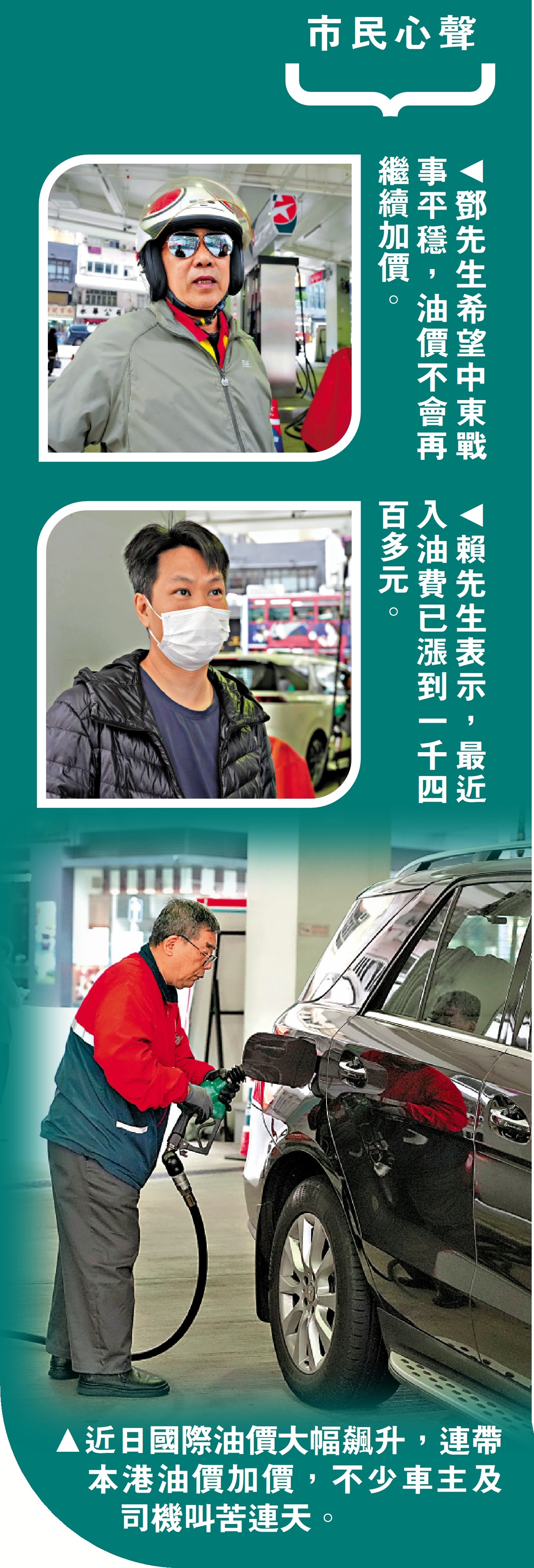 司機賴先生向大公報記者表示,平時有留意油價,近日看到手機上的油價數字每日都往上「跳」,「以前入滿油,需要1200元左右,最近幾日已經漲到1400多元,貴了大約兩三百元。」他表示,希望中東亂局盡快平息、停止戰爭,他指戰爭不僅令當地死傷慘重,也會影響全世界人民生活的方方面面,這是大家都不想看到的局面。